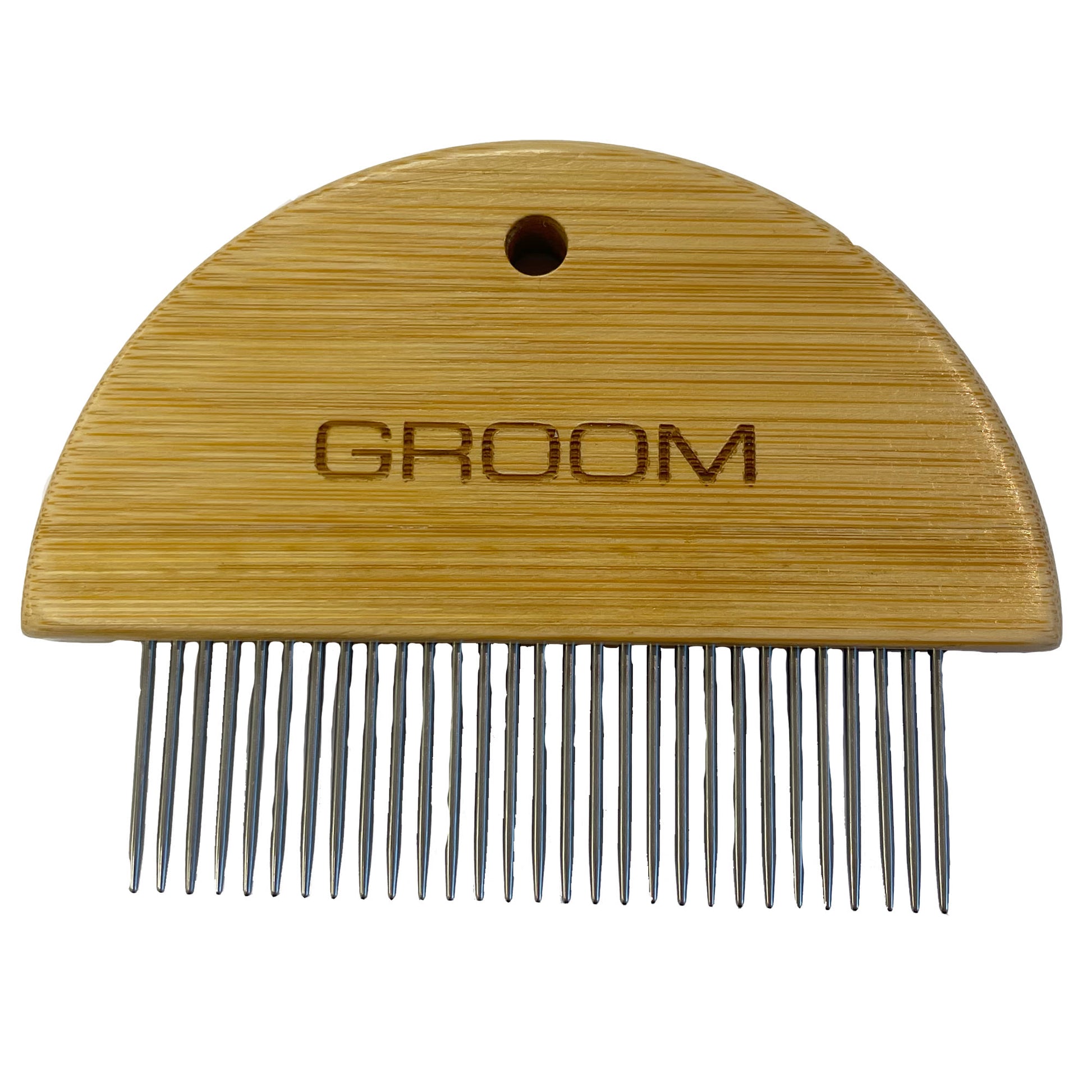 Our Bamboo Eco Groom range has been developed using bamboo materials. Better for the planet, this Eco range features a range of ergonomic grooming products for pets. This Bamboo Comb is suitable for all breed and coat types, but it ideal for short to medium hair. Regular combing with this Bamboo Comb keeps medium to long and thick coats free from tangles, knots and matts. This Bamboo Comb has durable stainless steel round edge pins to protect the skin and has been ergonomically designed with a comfort grip handle. Directions: Comb in the direction of the hair growth, combing small sections at a time until the coat is tangle free.