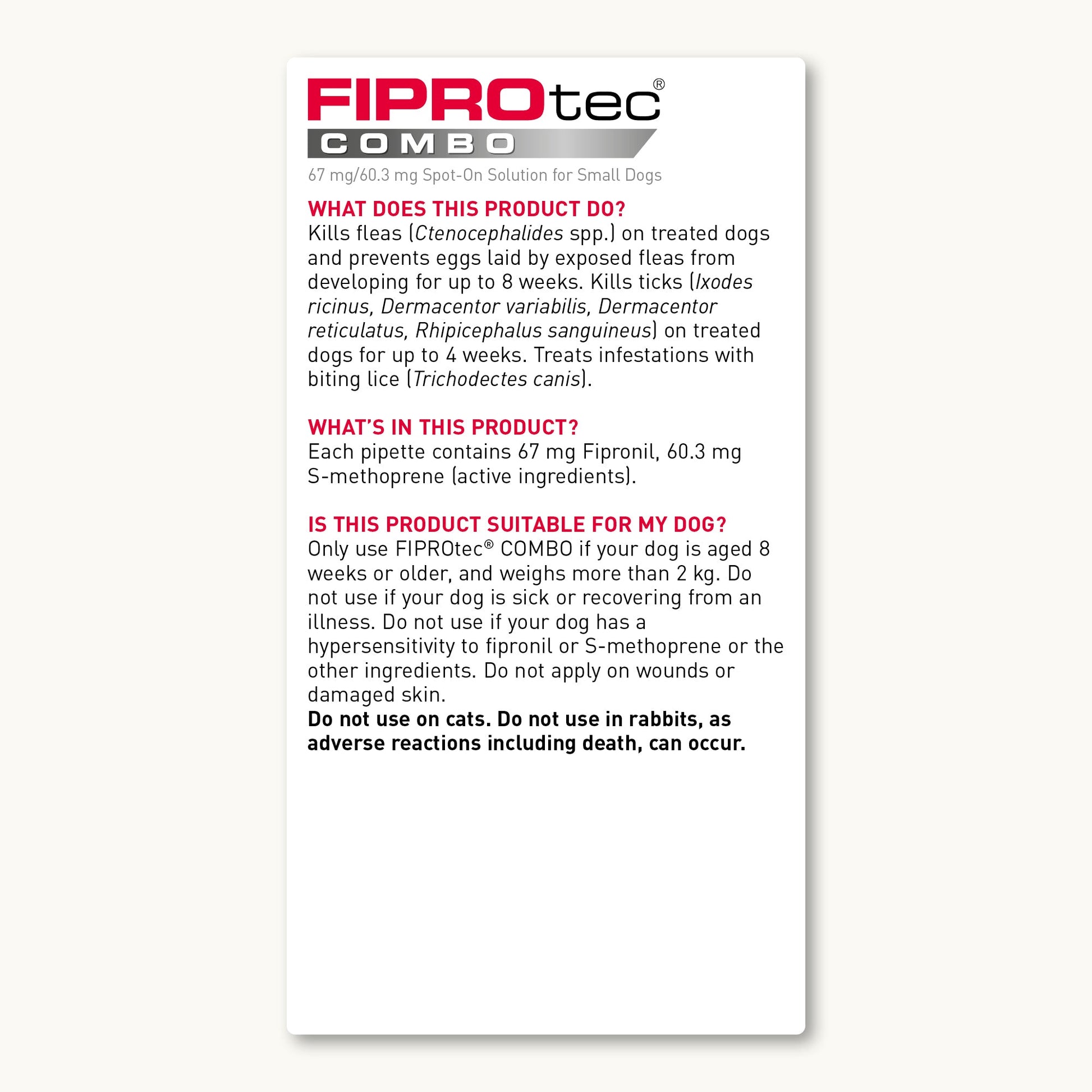 Beaphar FIPROtec COMBO for Small Dogs is tough on fleas and kills ticks too. This dual-action flea treatment for dogs is a veterinary medicine, available without prescription, that kills fleas and ticks, and prevents flea eggs and larvae developing in your home. For continuous protection, reapply every 4 weeks.