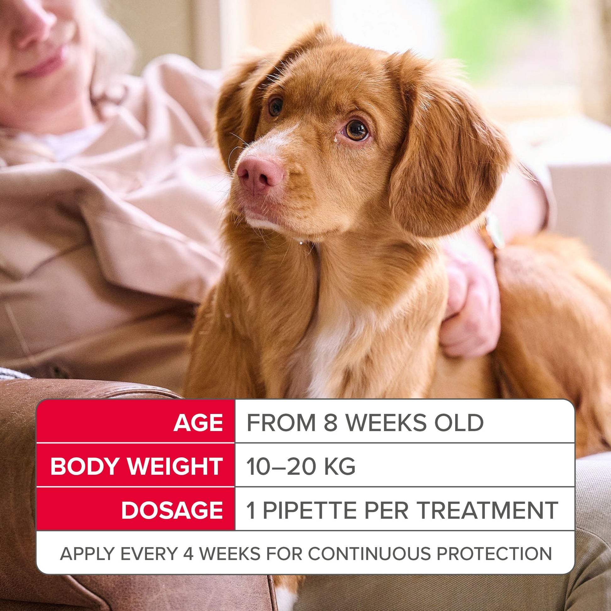 Weigh your dog carefully before application to ensure they weigh between 10–20kg. If your dog weighs more than 20kg, please use Beaphar FIPROtec Spot-On for Large Dogs (20-40kg), if less than 10kg, please use Beaphar FIPROtec Spot-On for Small Dogs (2-10kg)