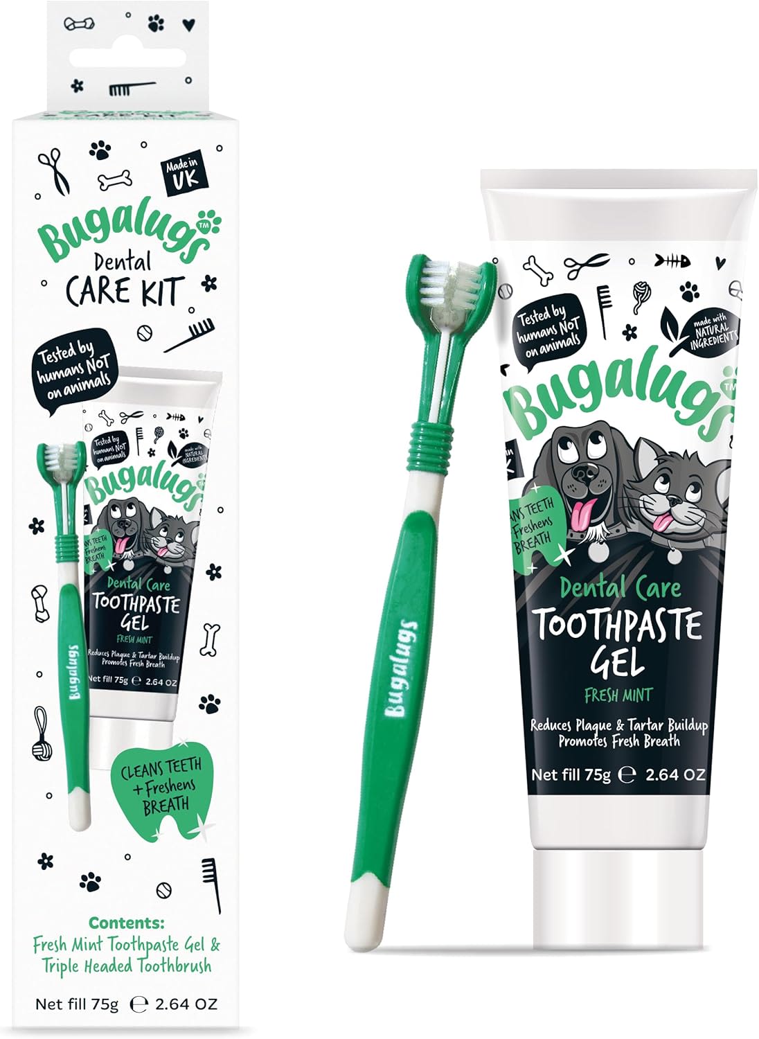 Bugalugs Dental Care Kit includes a Triple Headed Toothbrush and Toothpaste Gel which is made with natural ingredients that freshens breath quickly, helps reduces plaque & tartar buildup and cleans teeth.