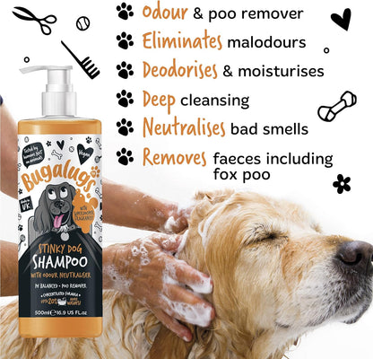 Bugalugs Stinky Dog Shampoo for smelly dogs contains an odour neutraliser that eliminates malodours with a long-lasting fresh fragrance of citrus and bergamot.