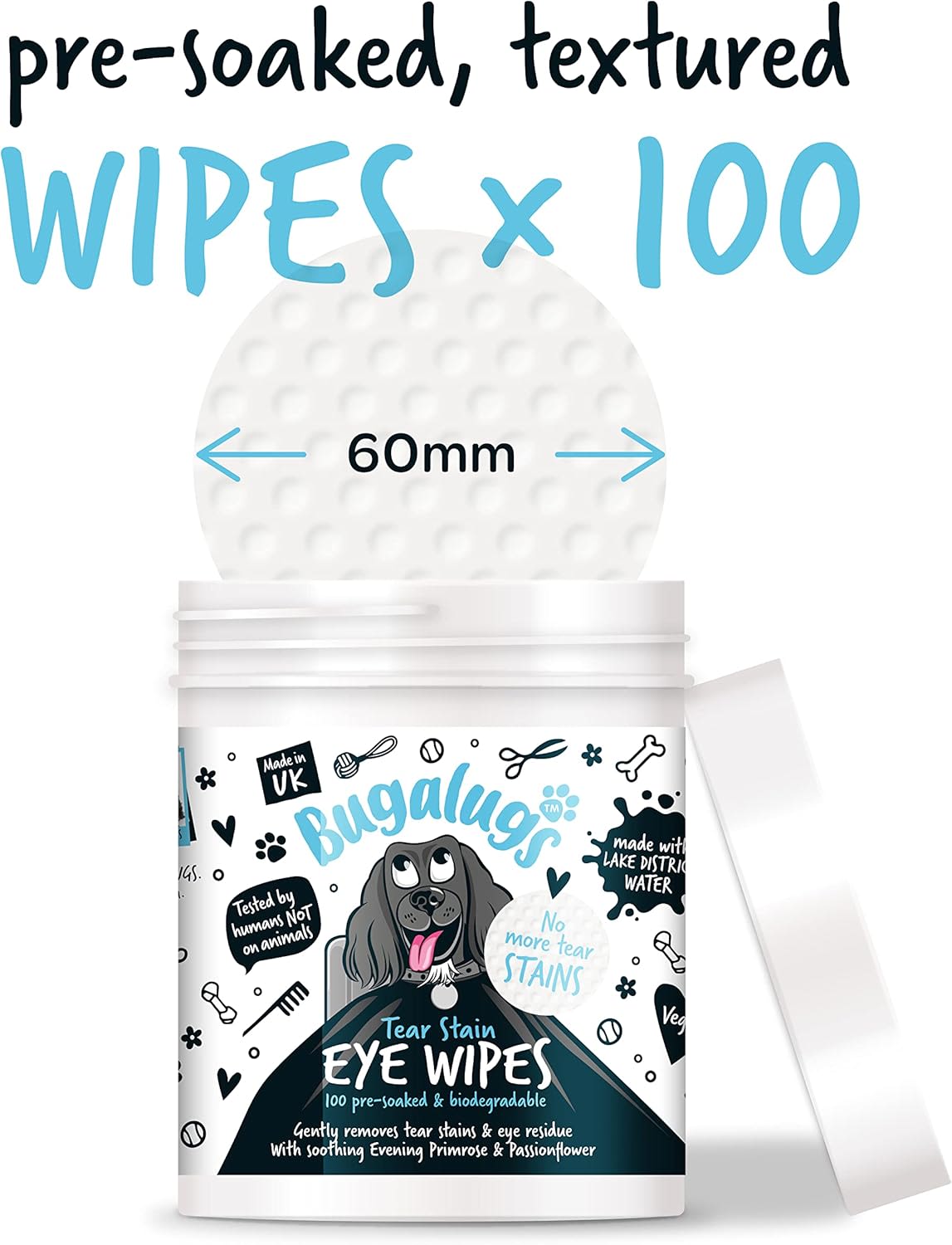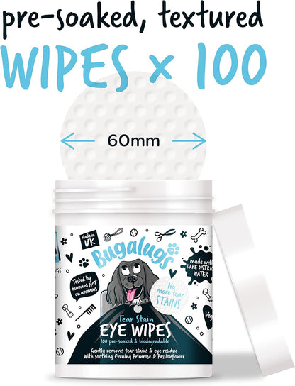 Bugalugs Eye Wipes for dogs help keep your dog’s eyes clean and healthy, with our natural formula, gently and effectively wiping away tear stains and other discharge. The pre-soaked wipes are 100% bio-degradable and are safe to use as part of your daily routine to promote positive eye health.