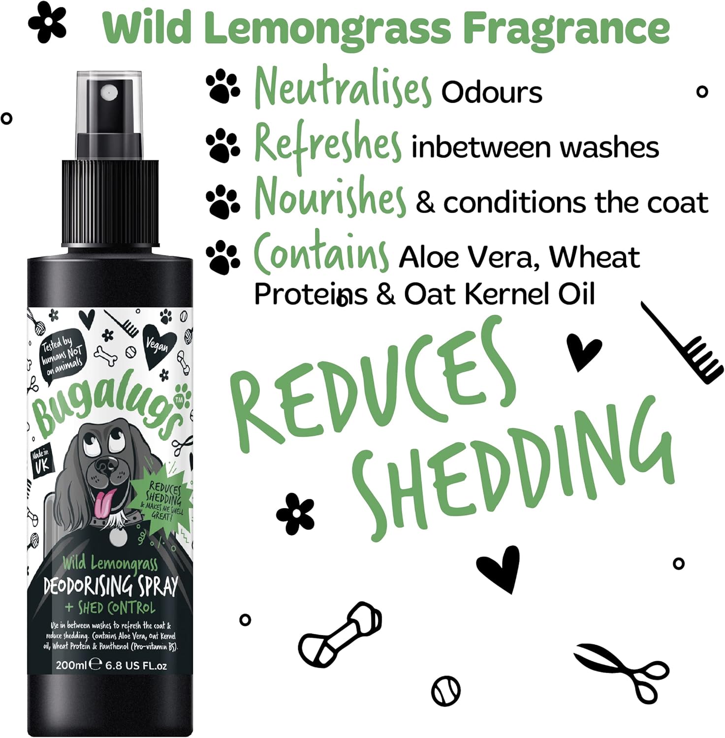 Bugalugs Wild Lemongrass Dog Deodorising Spray with Shed Control, cleans, deodorises, nourishes and reduces shedding with a long-lasting wild lemongrass fragrance.