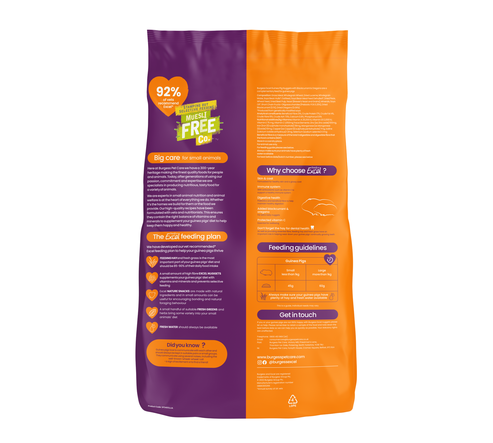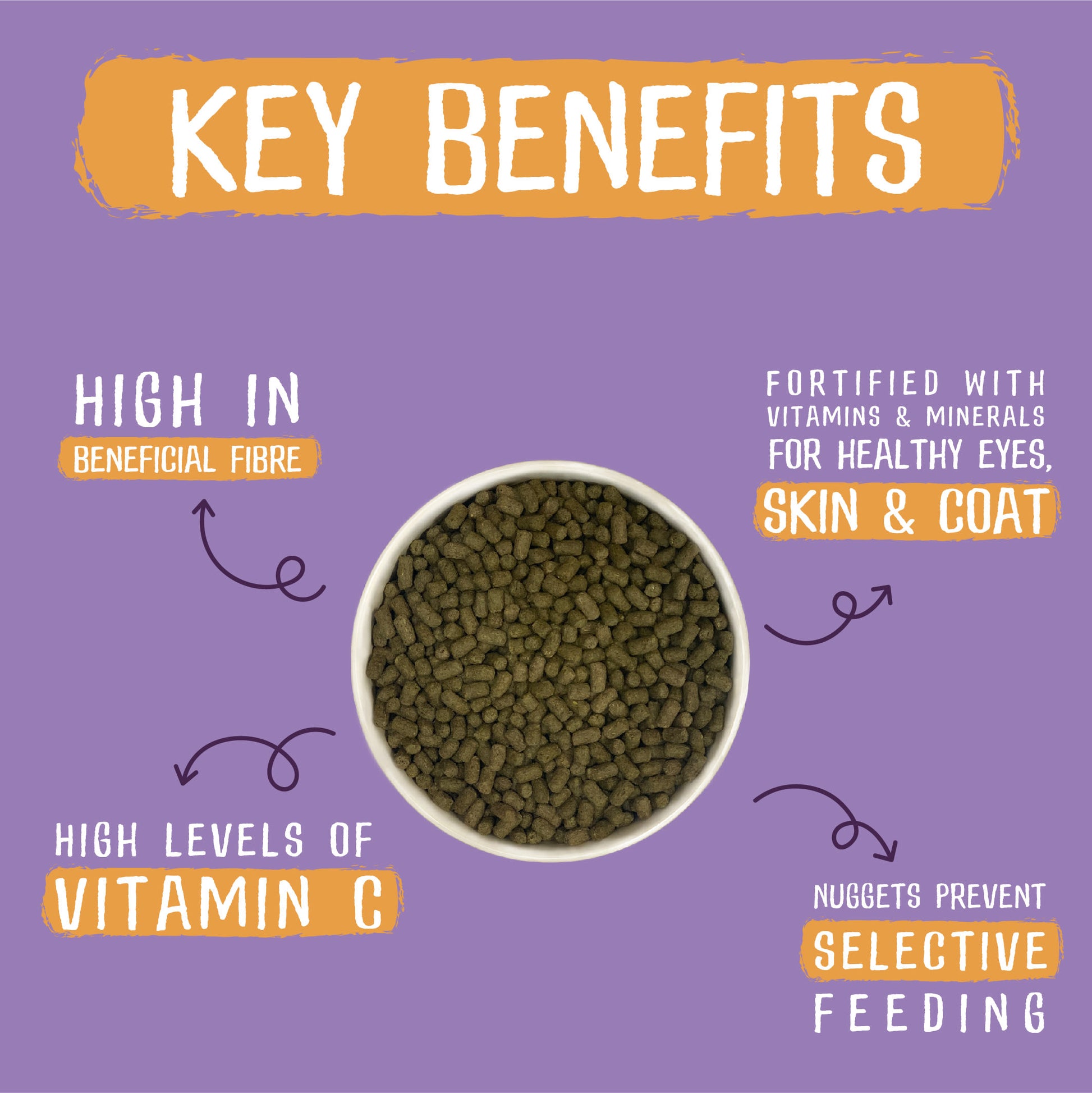 Protected vitamin C essential for wellbeing, Added blackcurrant and oregano for extra tasty nuggets, "Skin & coat - Formulated to support healthy skin and a glossy coat, Immune system - With antioxidants such as vitamin E to support a healthy immune system, Digestive health - Prebiotics and beneficial fibre to help maintain healthy digestion", Don’t forget the hay for dental health. As well as providing essential fibre, feeding hay and fresh grass have an important role in helping wear down your guinea pigs' continually growing teeth.