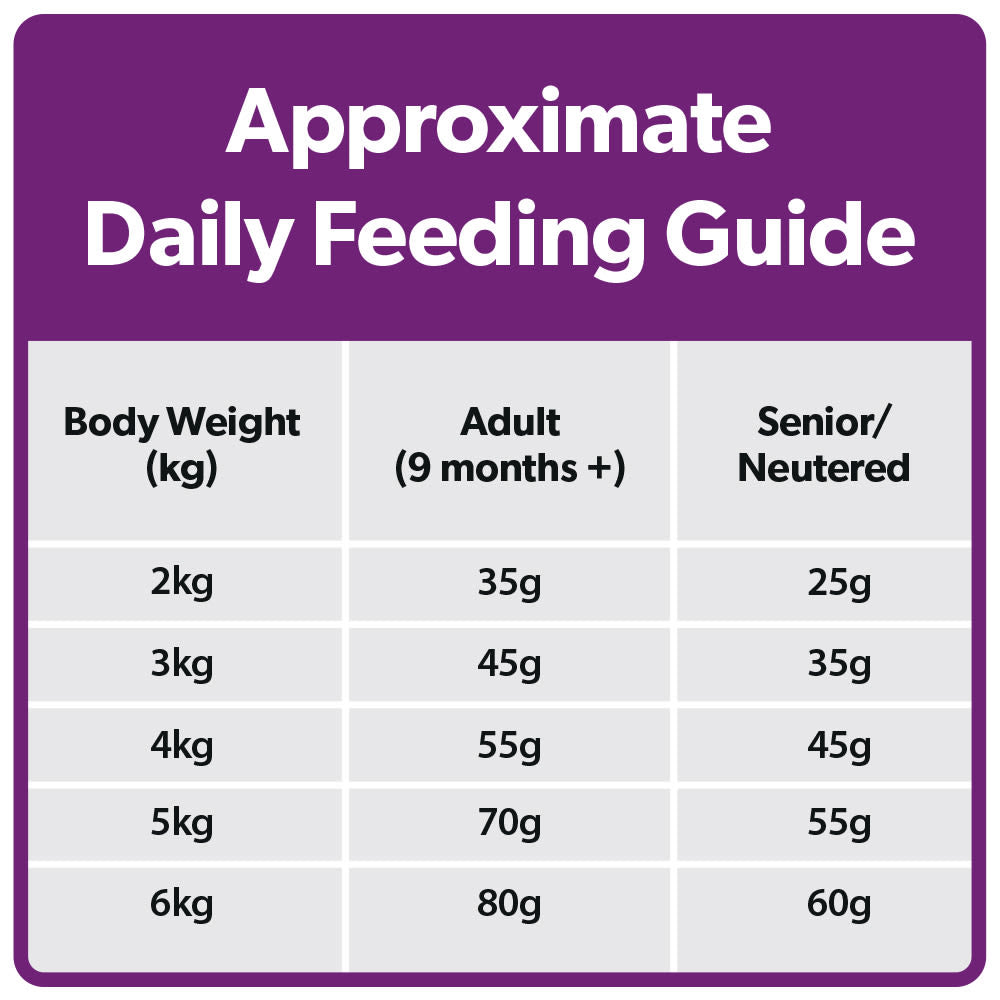 Analytical Constituents: Crude Protein 31%, Crude Fat 15%, Crude Fibre 1.5%, Crude Ash 7%, Copper 12mg/kg, Sodium 0.3%, Calcium 2%, Phosphorus 1.4%, Magnesium 0.12%, Potassium 0.55%, Omega-6 fatty acids 3.2%, Omega-3 fatty acids 0.7%.
