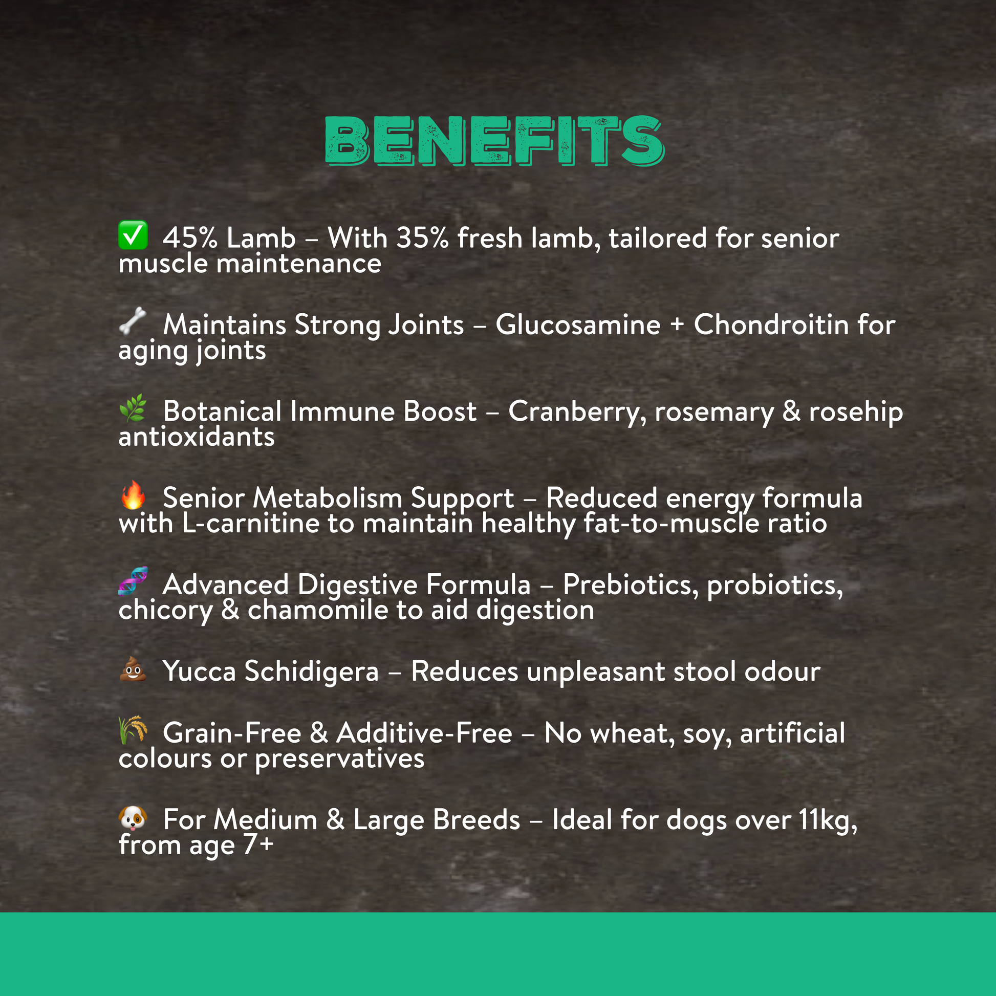 Composition: Fresh lamb (35%), sweet potato (17.5%), pea protein, dehydrated lamb (7%), peas (7%), apple pulp (7%), dehydrated carrot (0.45% equivalent to 4% carrots), hydrolyzed lamb liver (3%), dehydrated cranberry (0.08% equivalent to 0.75% cranberries), chicken fat, brewer’s yeast, fish oil, minerals, chicory (source of fos), mannan-oligosaccharides (mos), camomile, parsley, rosehips, sea algae, rosemary, cloves, glucosamine (350 mg/kg), cartilage (a source of chondroitin 250 mg/kg), yucca schidigera.