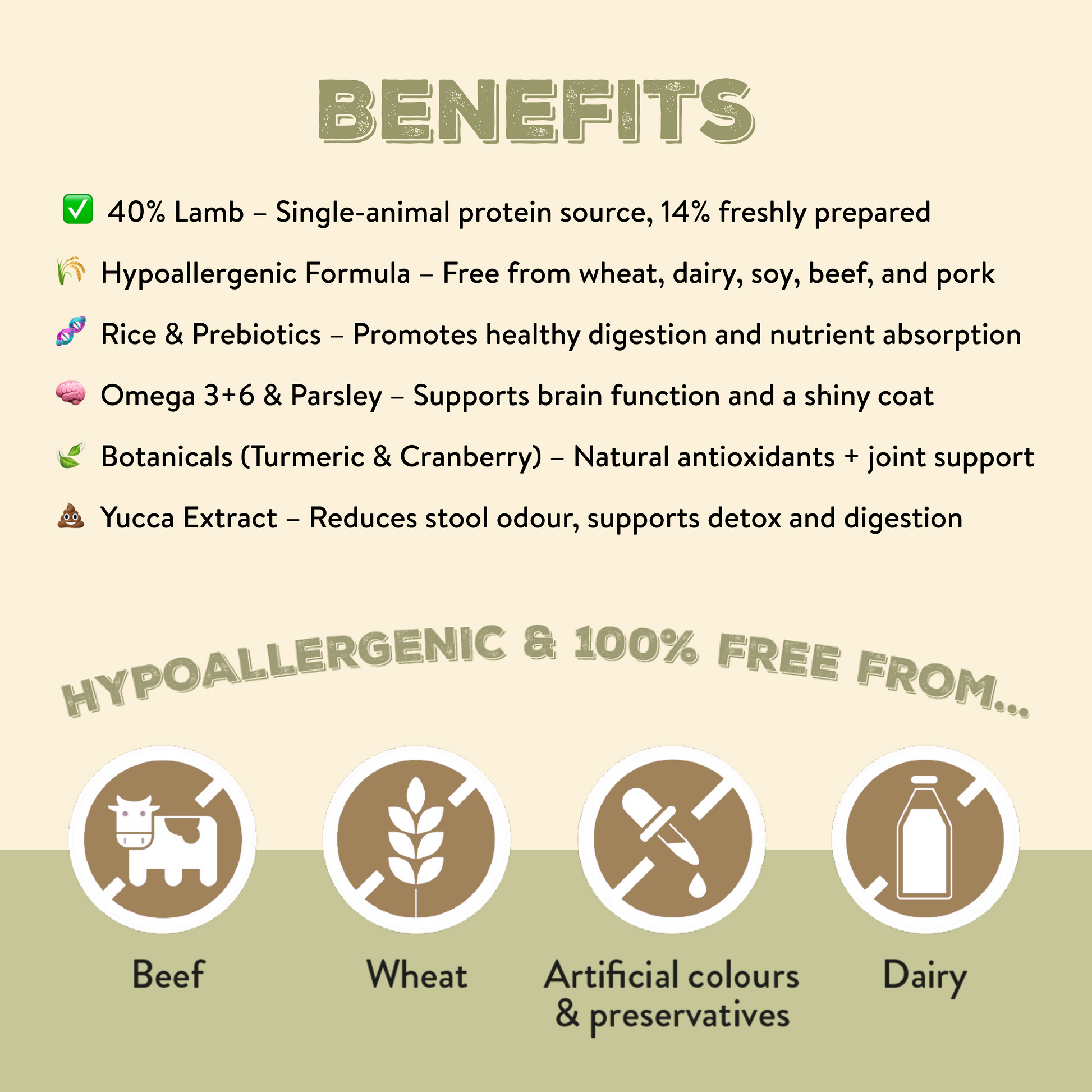 Composition: 40% Lamb (dried lamb 26%, freshly prepared lamb 14%), rice (30%), barley (16%), peas (5%), rapeseed oil (4%), beet pulp (3%), linseed (1%), minerals, chicory (source of prebiotic fos) (1000mg/kg), mannanoligosaccharides (source of prebiotic mos) (1000mg/kg), turmeric (100mg/kg), parsley (100 mg/kg), yucca (100mg/kg), dried cranberry (100mg/kg).