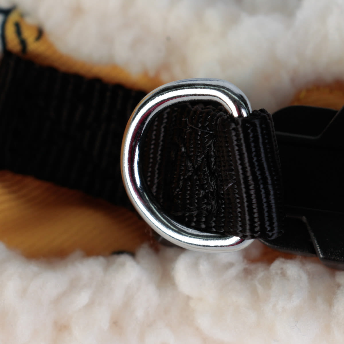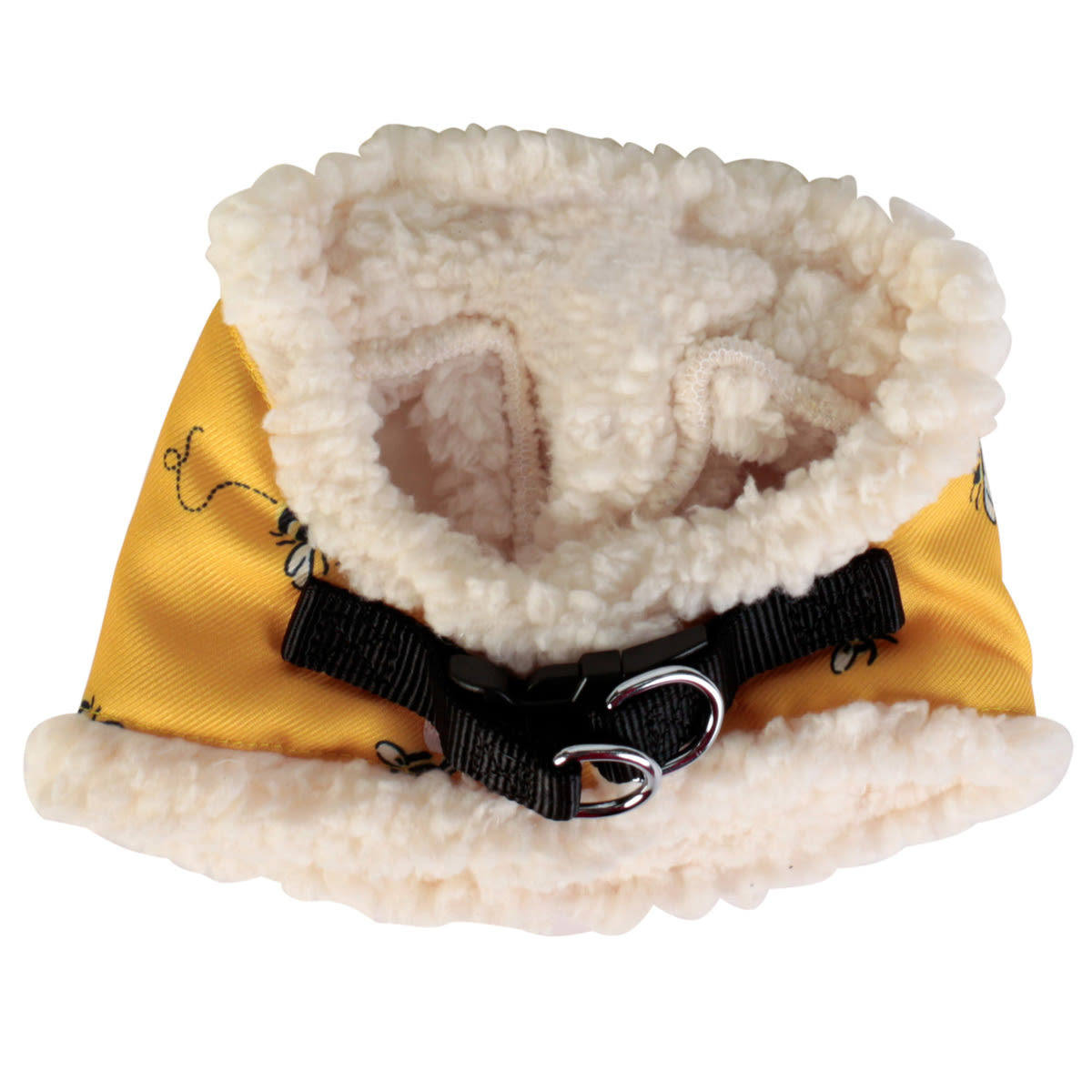 This comfortable and stylish dog harness boasts a beautiful print of bees against a bright, sunshine yellow colour.