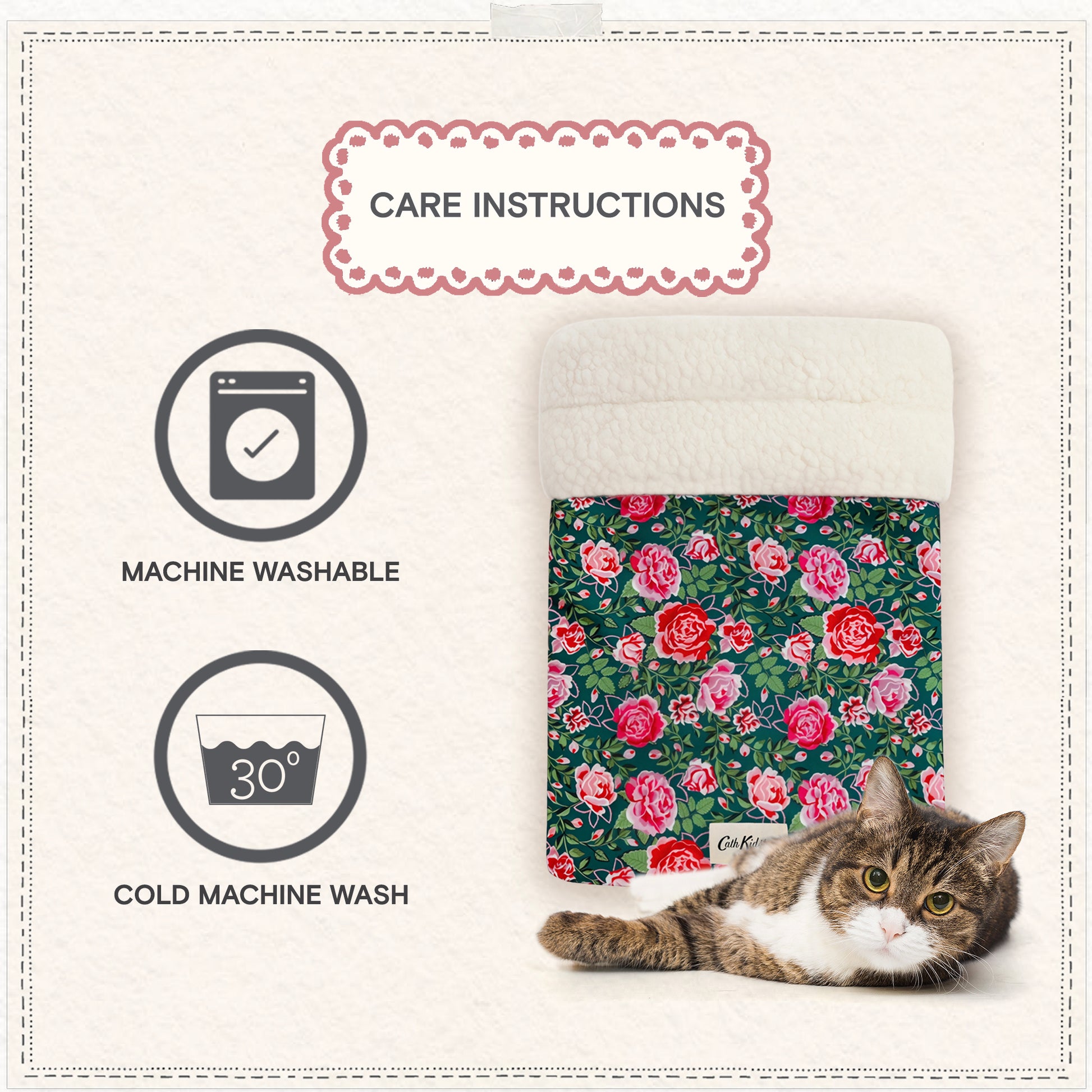 Made from durable, flame-retardant-treated fabrics, it offers both safety and longevity while adding a touch of Cath Kidston’s signature charm to your home. It’s also machine washable at 30 degrees, making it easy to keep those muddy paw prints at bay! The non-slip base ensures the bed stays securely in place, even on hardwood or tiled floors, making it a versatile addition to any room.
