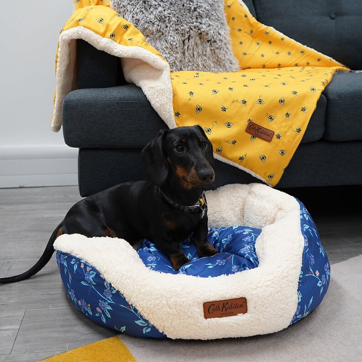 A stylish blue flower and bee print pet bed made in the UK with designer brand Cath Kidston. The thick plush material provides warmth and comfort for your dog. Finished with a branded leather label. A non-slip base makes this bed suitable for hard flooring. Machine washable at 30 degrees and has a non-slip base.