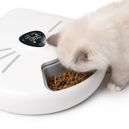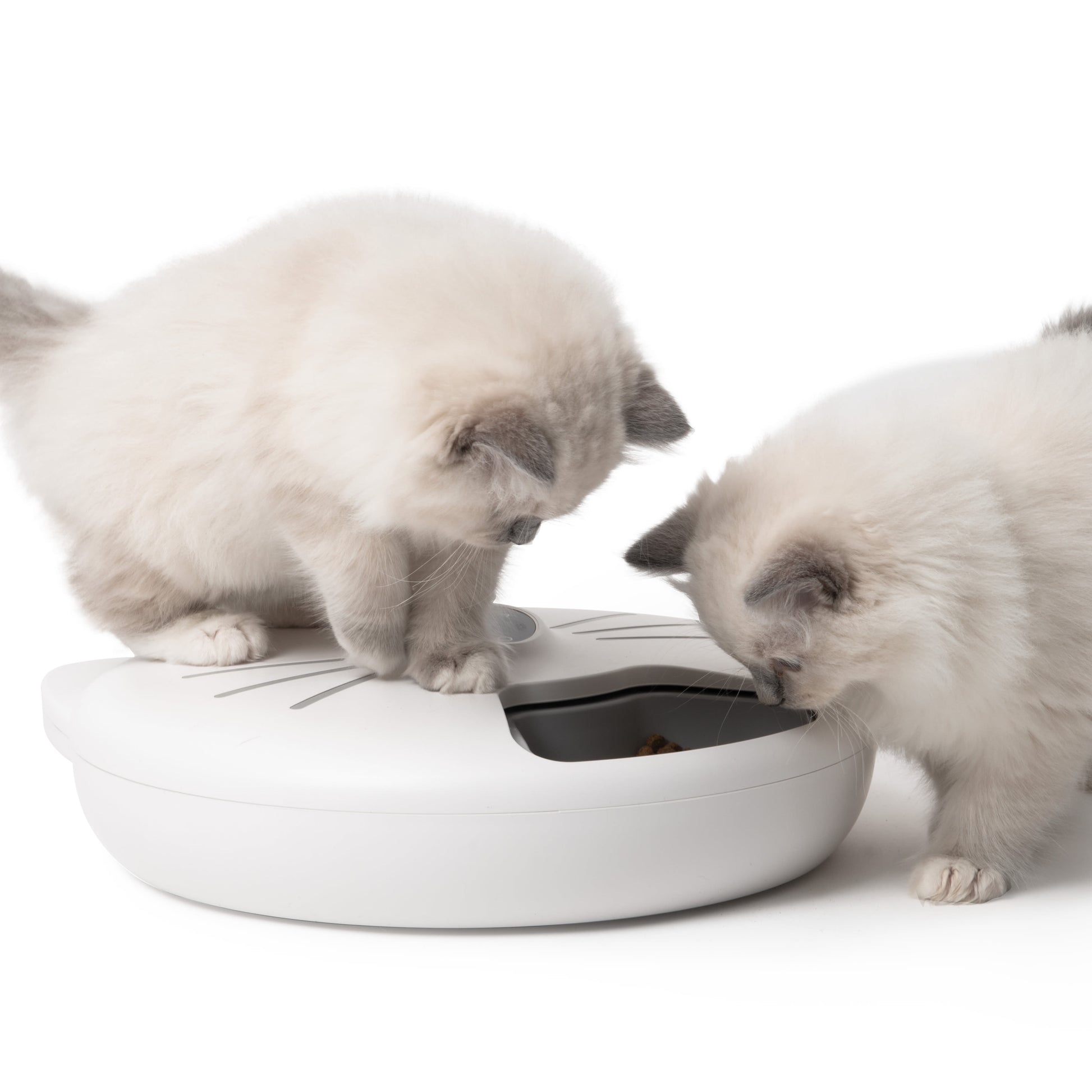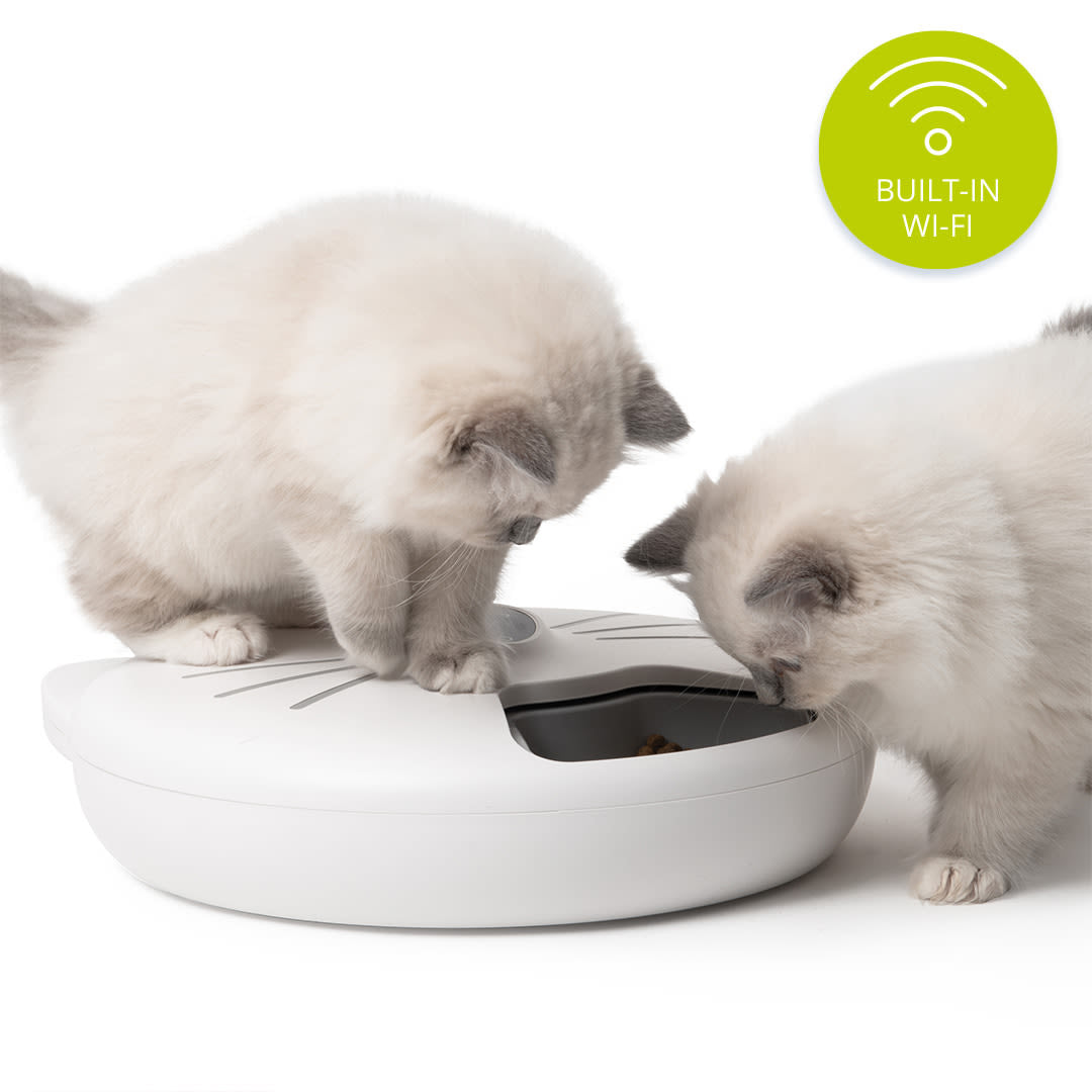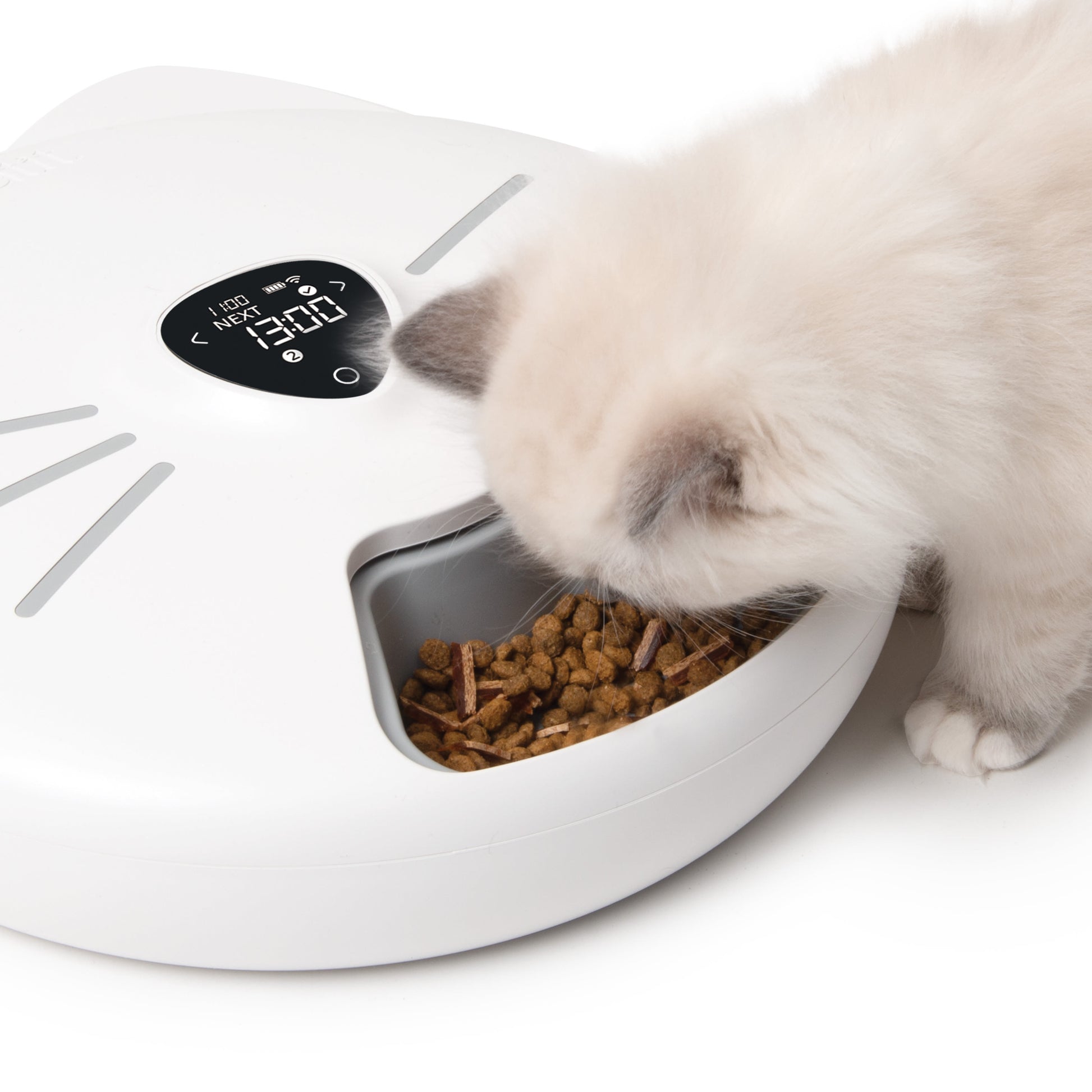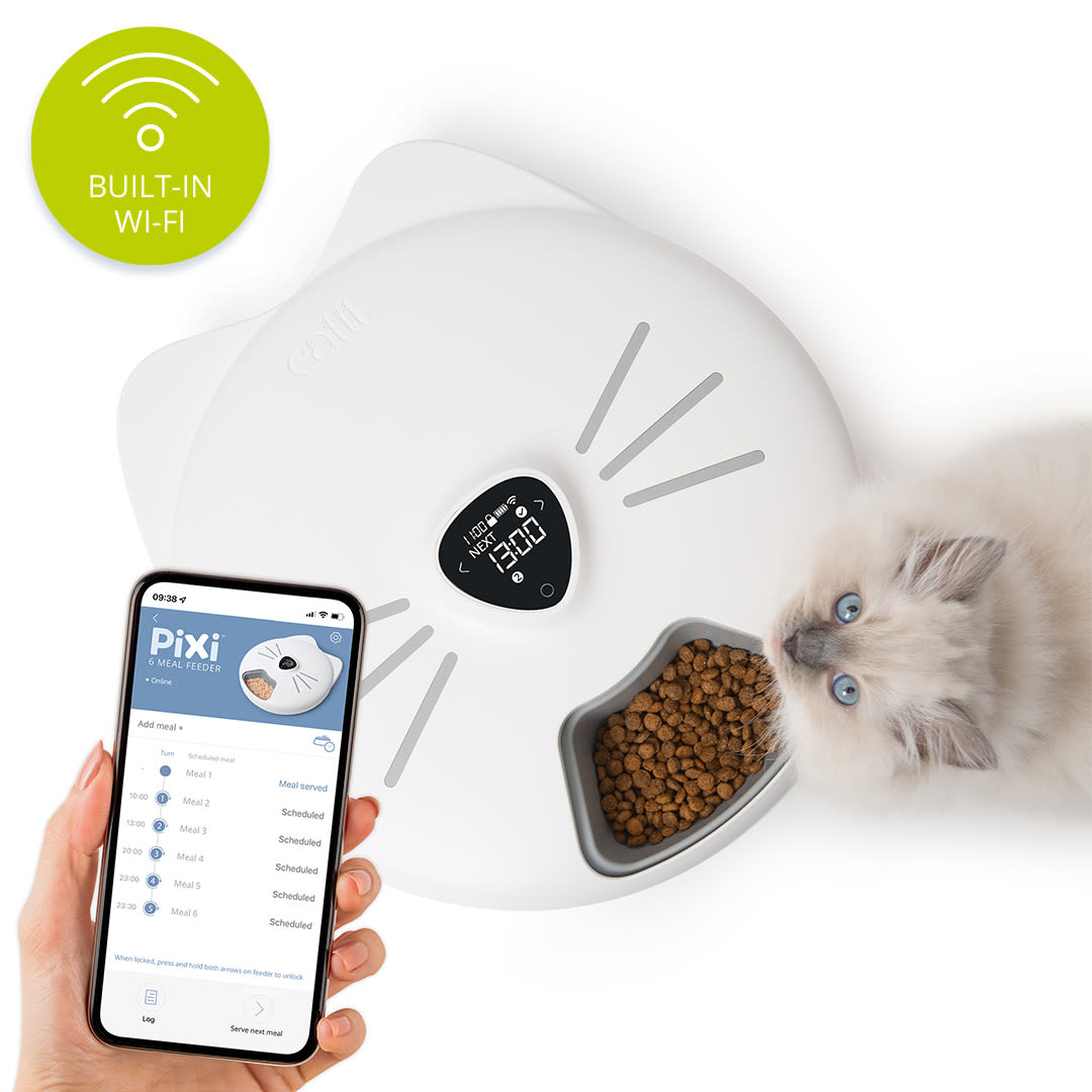 The Catit PIXI Smart 6-Meal Feeder enables you to feed your cat up to 6 varied meals per day, fully adapted to their feeding pattern. You only need to load the tray with healthy portions of your cat's preferred selection of dry food, wet food or treats, and the feeder will serve their daily meals as scheduled in the free Catit PIXI app. The 6-meal feeder features a cat-proof design and control panel lock to ensure there will be no snitching food, and that your cat is well-fed even when you're not at home! The feeding tray stops rotating when met with resistance, making sure your cat’s paws are safe from harm or entrapment. It's also possible to set and adjust the feeding schedule using the display on the feeder, or to skip ahead and serve the next meal. The app and feeder settings sync in real-time. There are 6 trays, but you determine the number of meals and amount of food that goes in. Pre-portioning your cat’s meals allows you to monitor their food intake, and helps prevent binging or overeating.