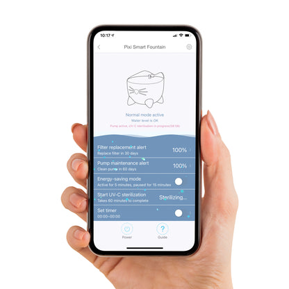 The super silent pump allows your cat to drink day and night without the fountain making a sound, so it doesn’t matter which room the fountain lives in. PIXI’s little nose not only provides a nightlight but also lights up in 4 different way to indicate through the water level window what status the fountain is at; replace the filter, UV-C sterilisation active, time to refill with water or water has completely run out. All the fountain alerts are sent directly to your phone through the Catit PIXI SmartApp where you can see what action you need to take.