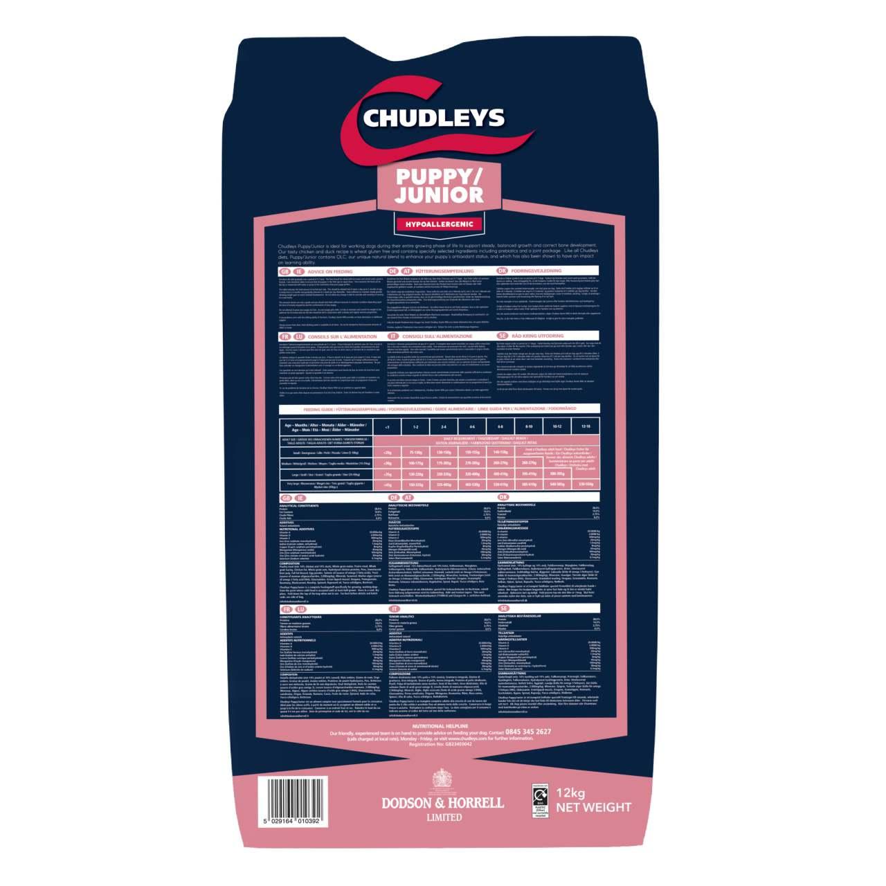 Chudleys puppy and junior is ideal for working dogs during their entire growing phase of life to support steady, balanced growth and correct bone development. Our tasty chicken and duck recipe is wheat gluten free and contains specifically selected ingredients, including prebiotics and a joint package. Like all chudleys diets, puppy/junior contains QLC, our unique natural blend to enhance your puppy's antioxidant status, which has also been shown to have an impact on learning ability.