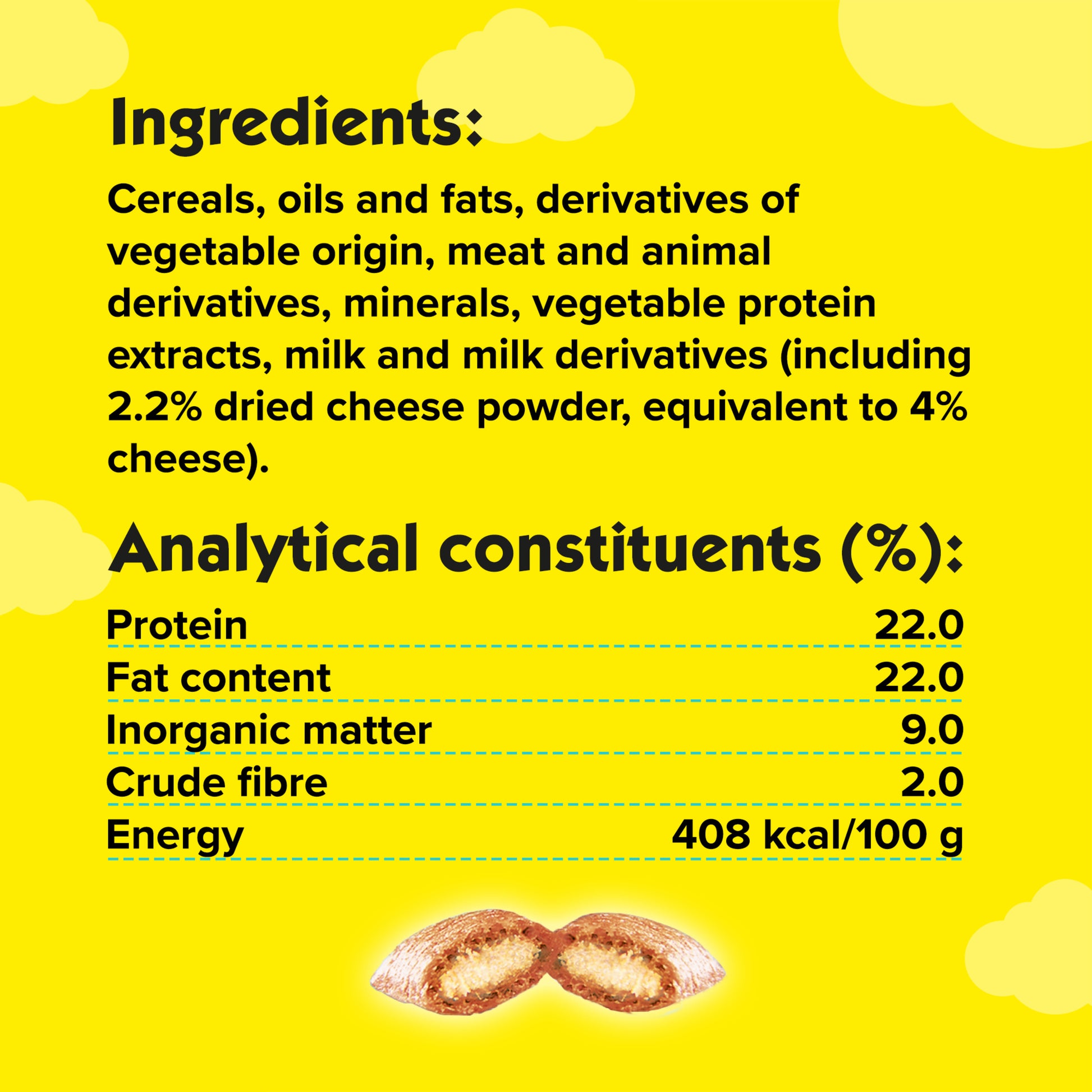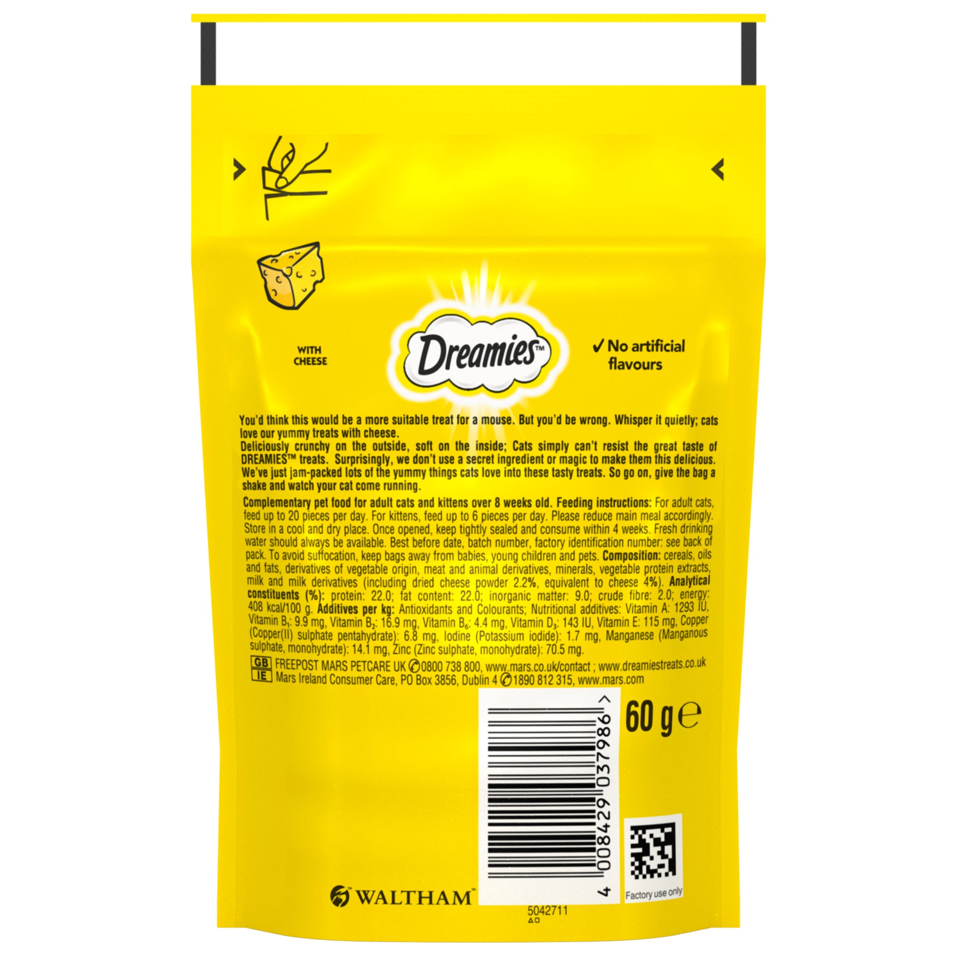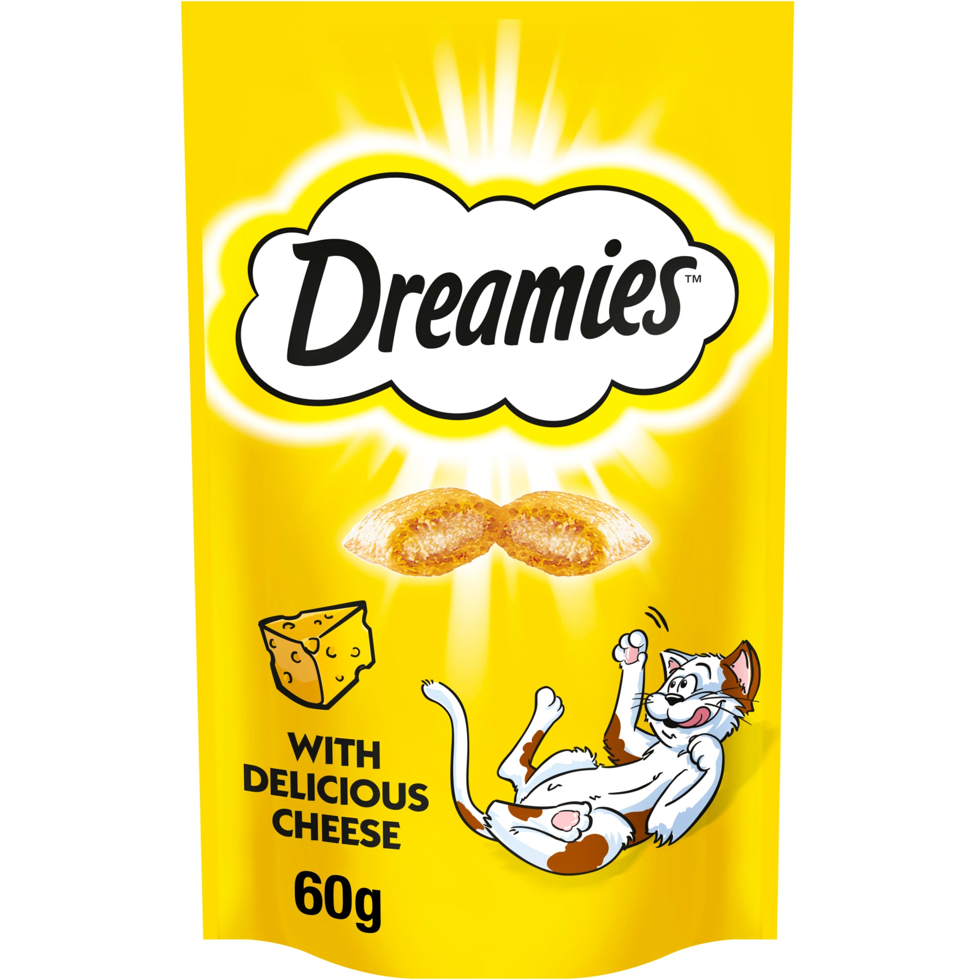 Dreamies cat treats are packed full of things cats love. Share moments with your feline friend with these dual-texture treats with an enticingly crunchy outside and a soft inside. Dreamies with Delicious Cheese contains vitamins and minerals, at just 2 calories per treat. So go on, give the bag a shake and watch your cat come running!.
