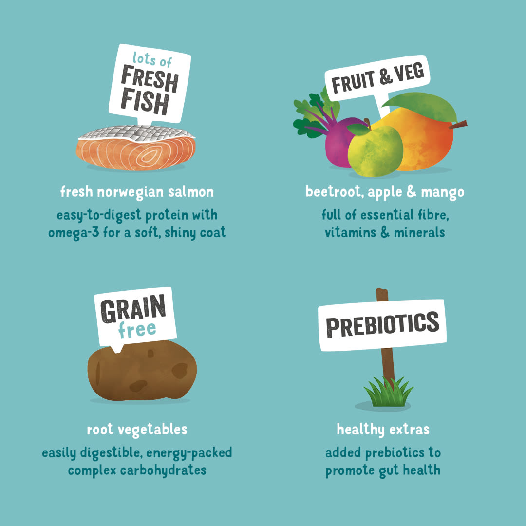 fresh salmon 40%, potato, peas, pea protein, linseed, fish oil, vegetarian gravy, minerals, botanical herbs 0.2% (marigold blossoms, nettle, blackberry leaves, fennel, caraway, chamomile, balm), mannan-oligosaccharides (MOS), fructo-oligosaccharides (FOS), beetroot 0.04%, apples 0.04%, mango 0.04%, avocado 0.04%, coconut 0.04%, spinach 0.04%, blackcurrants 0.04%.
