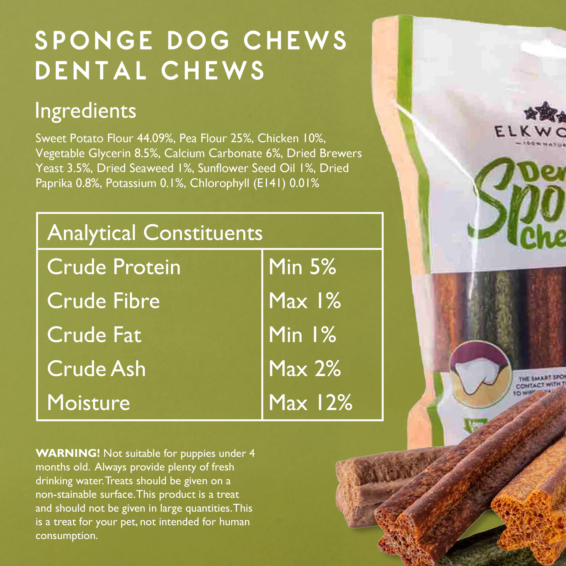 Each pack comes in four mouth-watering flavours: Duck & Sweet Potato, Fish & Seaweed, Chicken & Beetroot, and Chicken & Carrot. These flavourful treats will keep your pet engaged while supporting their oral hygiene, making them an ideal addition to any pet's daily routine. Elkwood Sponge Dental Sticks are the perfect combination of health and taste, ensuring that your dog’s teeth stay fresh and their gums stay healthy.