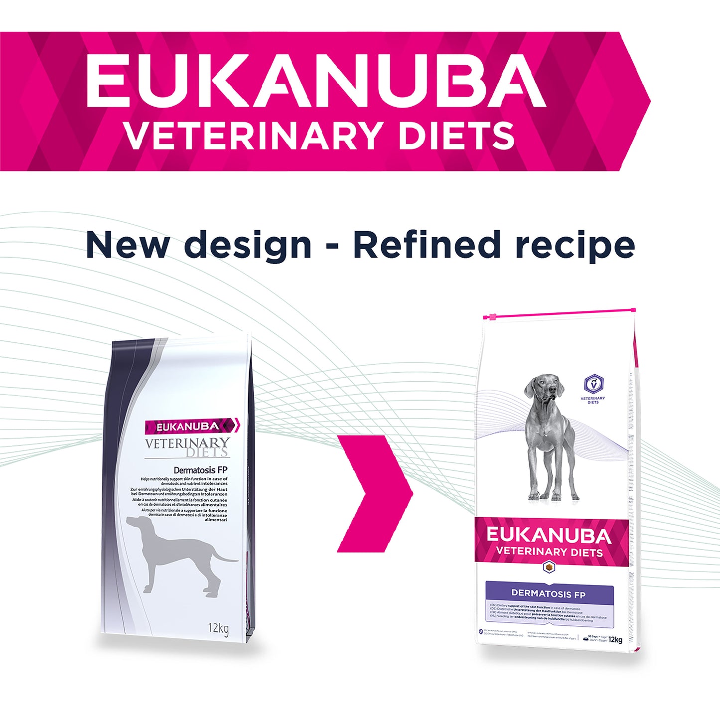 Eukanuba Veterinary Diets Dermatosis FP is formulated with specially selected protein (fish) and carbohydrate sources (potato) to support the veterinary management of ingredient and nutrient intolerances that can cause skin and /or gastrointestinal signs. A targeted ratio of omega-6:omega-3 fatty acids help to support a healthy skin and shiny coat. These diets contain additional ingredients that help support skin and coat health, gastrointestinal health and overall health and well-being. It is recommended that a vets opinion be sought before use.