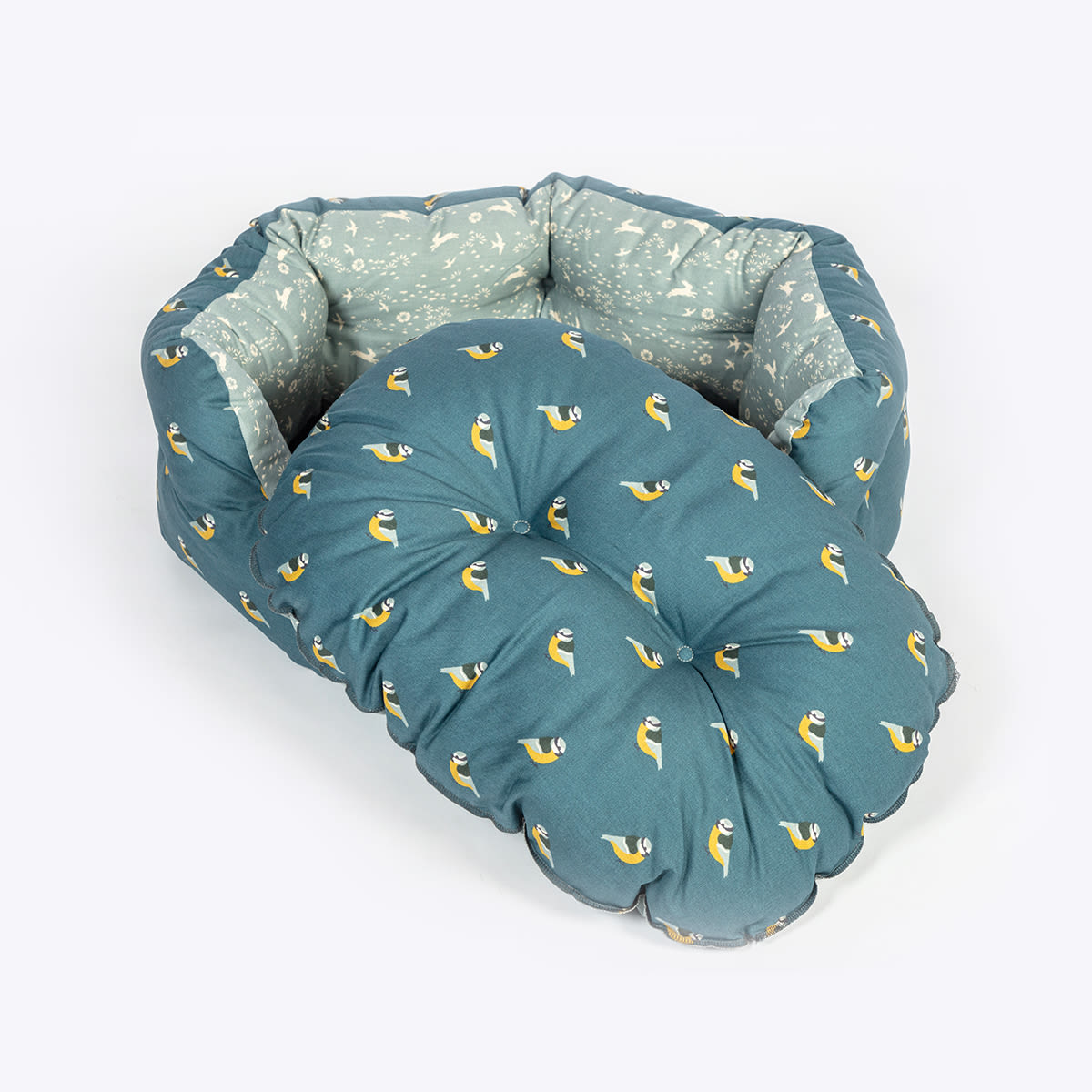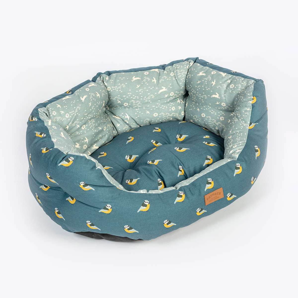 The deluxe slumber bed offers your furry friend the perfect place to snuggle up, with soft high sides for optimum warmth and the ideal head rest! These fresh and bright FatFace prints feature two bird prints in teal and duck egg blues. FatFace cotton products supports more sustainable cotton farming. The bed is filled with a soft and fluffy polyester fibre filling which provides a lot of warmth and comfort. Made from a blend of standard and recycled PET flake, made from recycled plastic bottles which are cleansed, shredded and heated to form fibres. The filling is fire retardent to British Standard 5852.