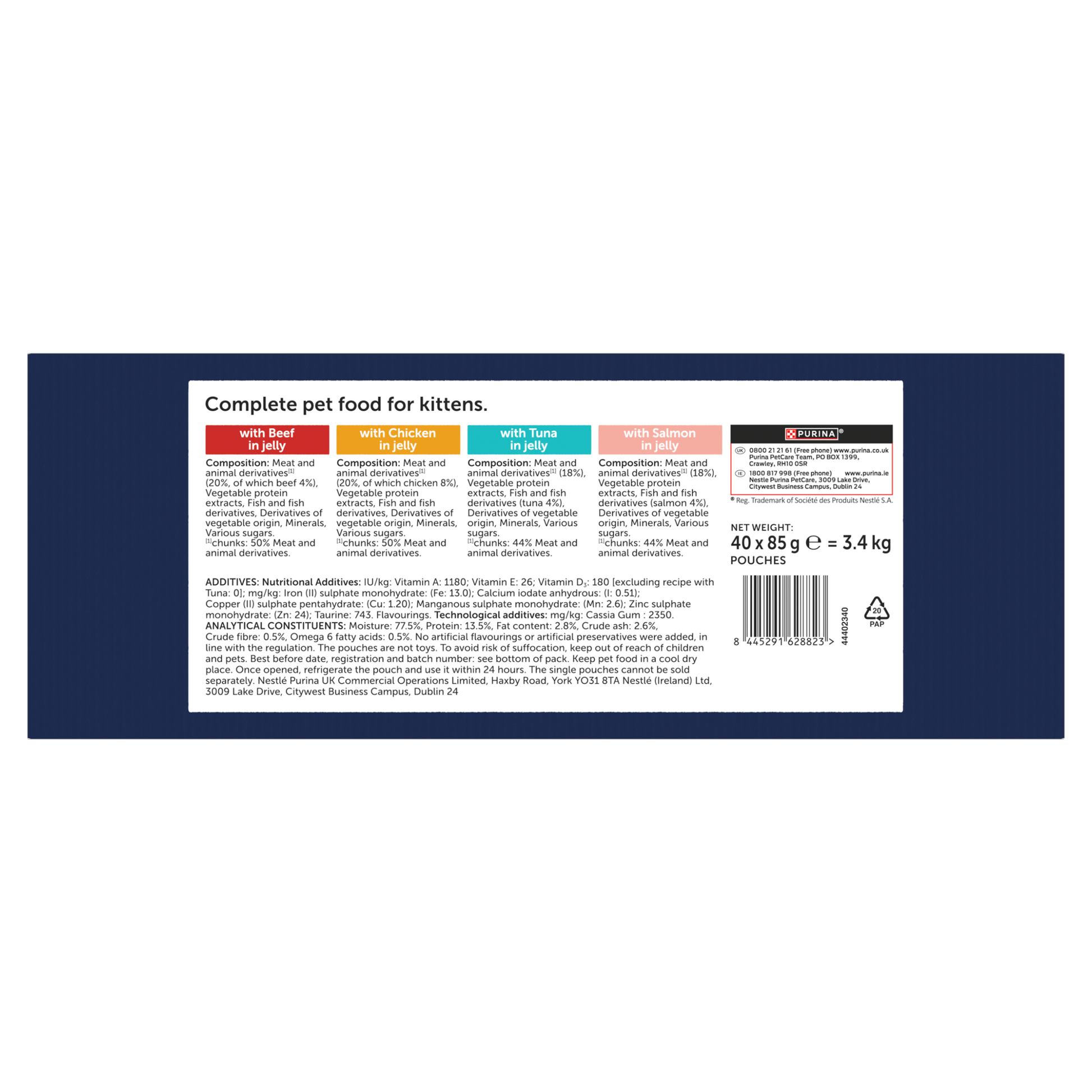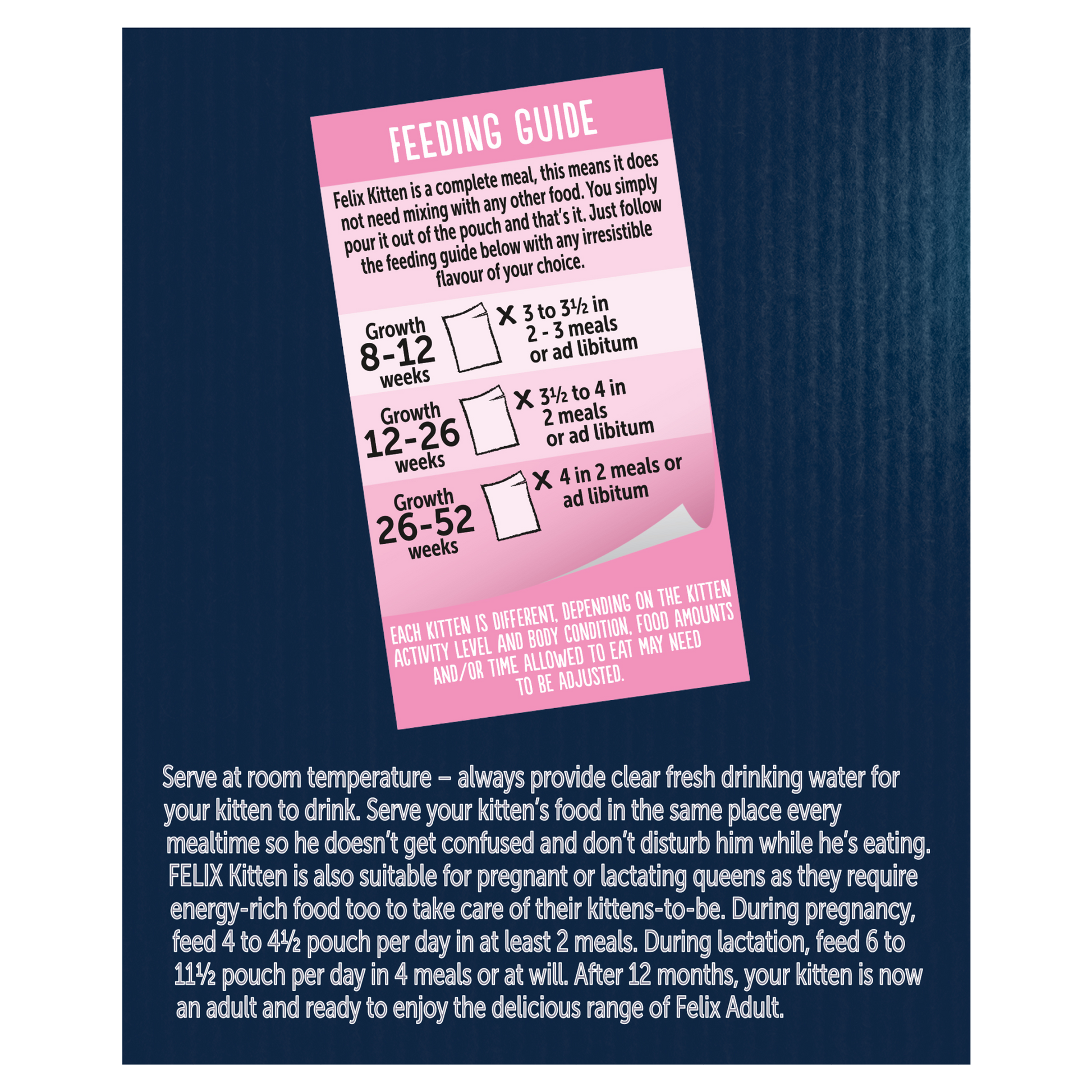 Felix Kitten is a complete meal, this means it does not need mixing with any other food. You simply pour it out of the pouch and that’s it. Just follow the feeding guide below with any irresistible flavour of your choice.
