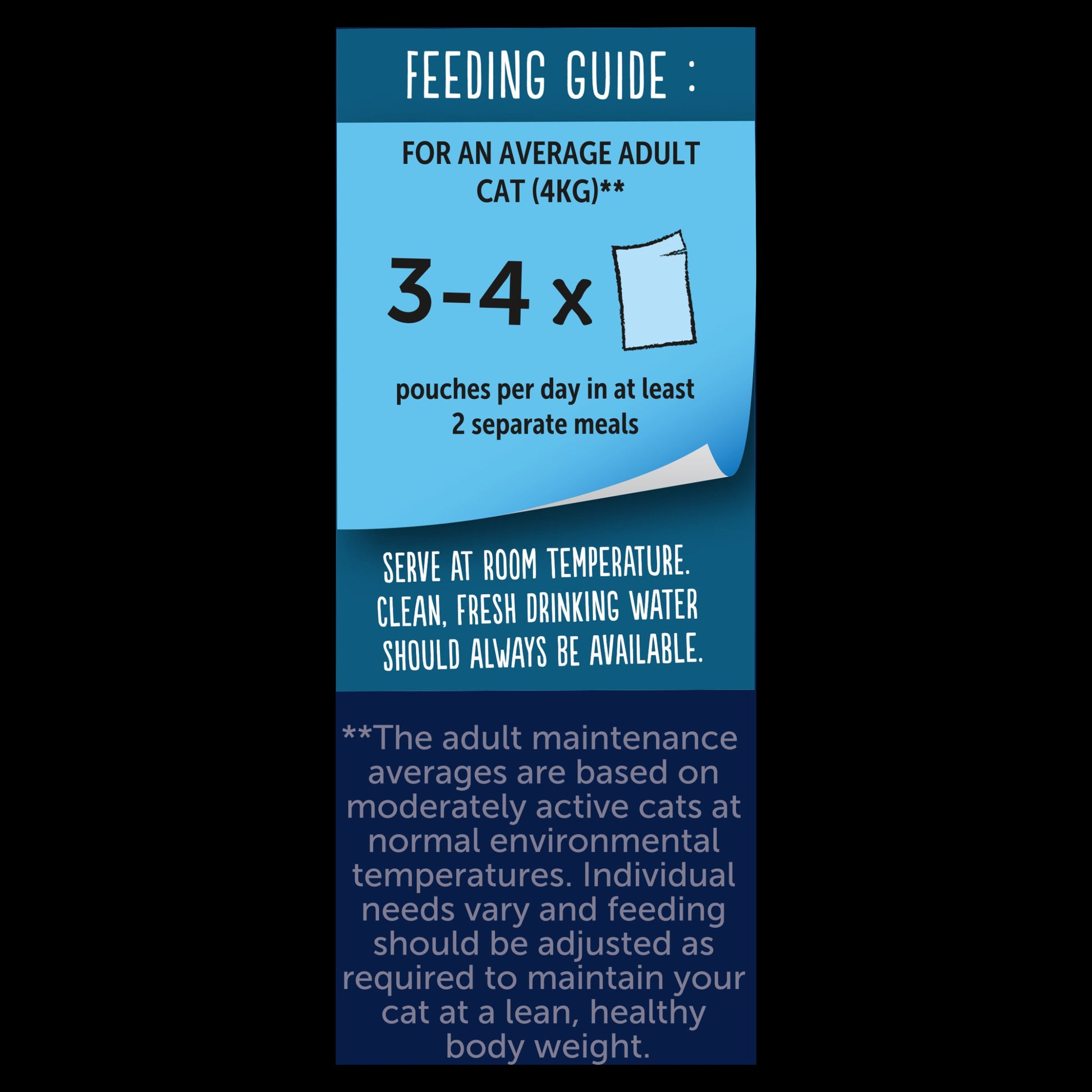 For an average adult cat (4kg), feed 3 to 4 pouches per day in at least 2 separate meals. The adult maintenance averages are based on moderately active cats at normal environmental temperatures. Individual needs vary and feeding should be adjusted as required to maintain your cat at a lean, healthy body weight. Serve at room temperature. Clean, fresh drinking water should always be available.