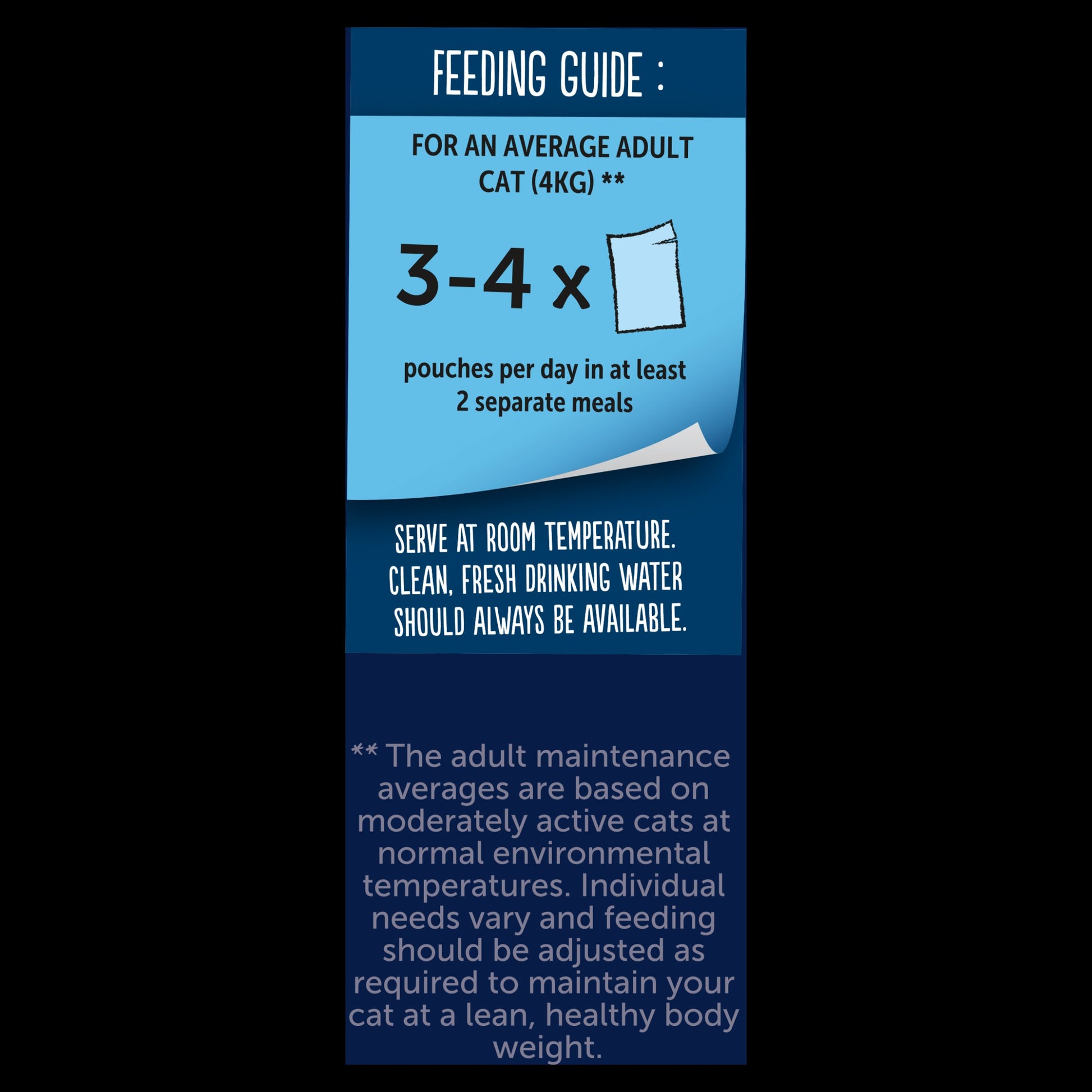For an average adult cat (4kg), feed 3 to 4 pouches per day in at least 2 separate meals. The adult maintenance averages are based on moderately active cats at normal environmental temperatures. Individual needs vary and feeding should be adjusted as required to maintain your cat at a lean, healthy body weight. Serve at room temperature. Clean, fresh drinking water should always be available.