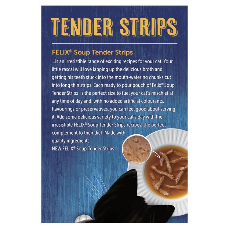 Felix® Soup Tender Strips is an irresistible range of exciting recipes for your cat. Your little rascal will love lapping up the delicious broth and getting his teeth stuck into the mouth-watering chunks cut into long thin strips. Each ready to pour pouch of Felix® Soup Tender Strips is the perfect size to fuel your cat's mischief at any time of day and, with no added artificial colourants, flavourings or preservatives, you can feel good about serving it. Add some delicious variety to your cat's day with the irresistible Felix® Soup Tender Strips recipes, the perfect complement to their diet.