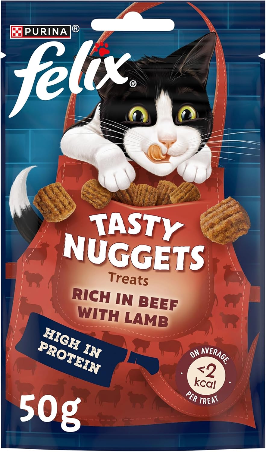 Felix tasty nuggets are delightful high protein treats made with a delicious pairing of flavours to give your cat a tasty moment and an excitibly different texture. This dual flavour recipe rich in beef with lamb is less than 2 kcal per treat on average and without colourants. Surprise your cat with these delicious high in protein treats with vitamins to keep your cat ready for more fun. Felix tasty nuggets the delicious high protein treats for a moment in between meals full of flavour!