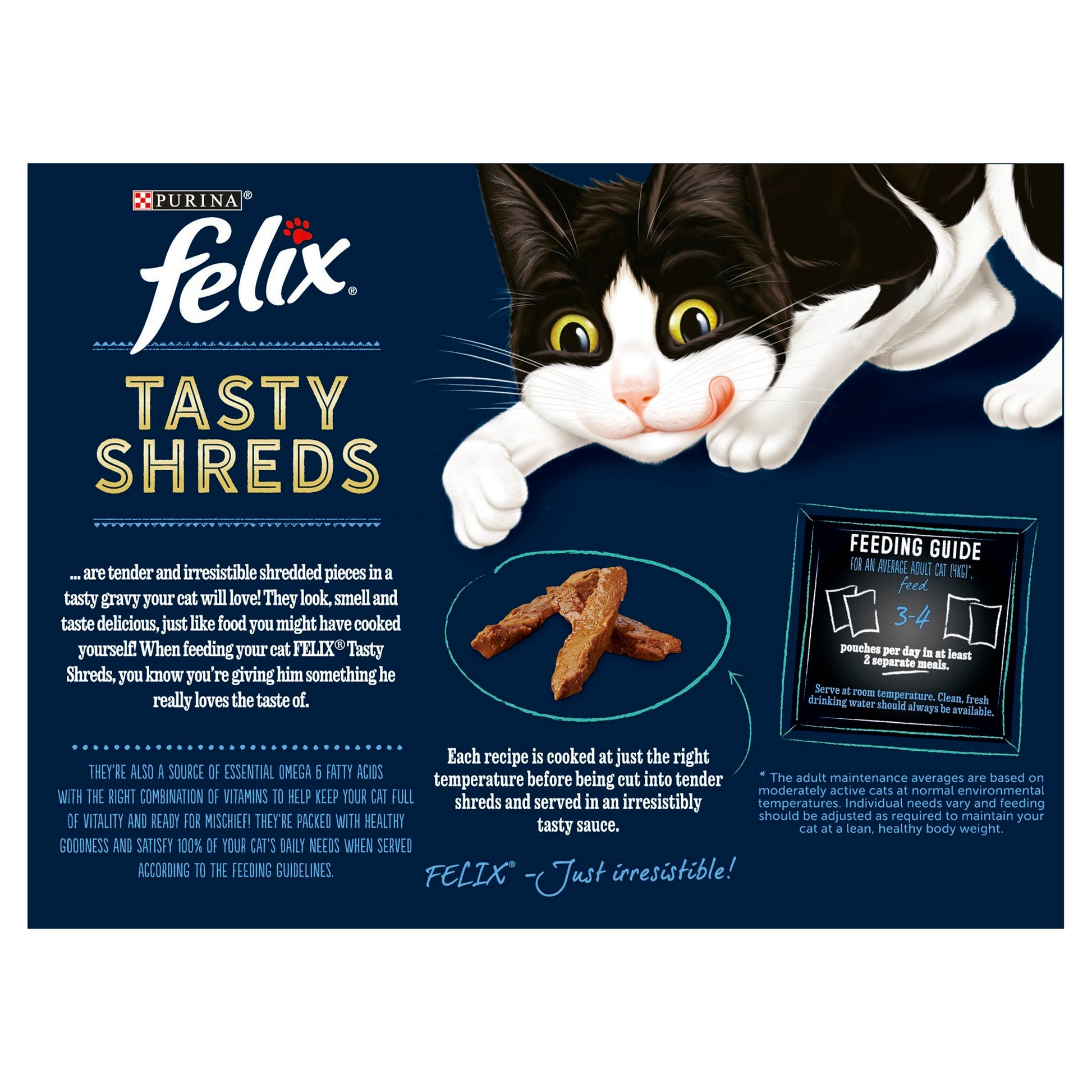 Felix Tasty Shreds are tender and irresistible shredded pieces in a tasty gravy your cat will love! They look, smell and taste delicious, just like food you might have cooked yourself Each recipe is cooked at just the right temperature before being cut into tender shreds and served in an irresistibly tasty sauce. When feeding your cat Felix Tasty Shreds, you know you're giving him something he really loves the taste of. They're also a source of essential Omega 6 fatty acids with the right combination of vitamins to help keep your cat full of vitality and ready for mischief They're packed with healthy goodness and satisfy 100% of your cat's daily needs when served according to the feeding guidelines.That's not all! felix Tasty Shreds meals are available in a range of delicious recipes, to satisfy your cat's love of variety every day. Felix - Just irresistible.