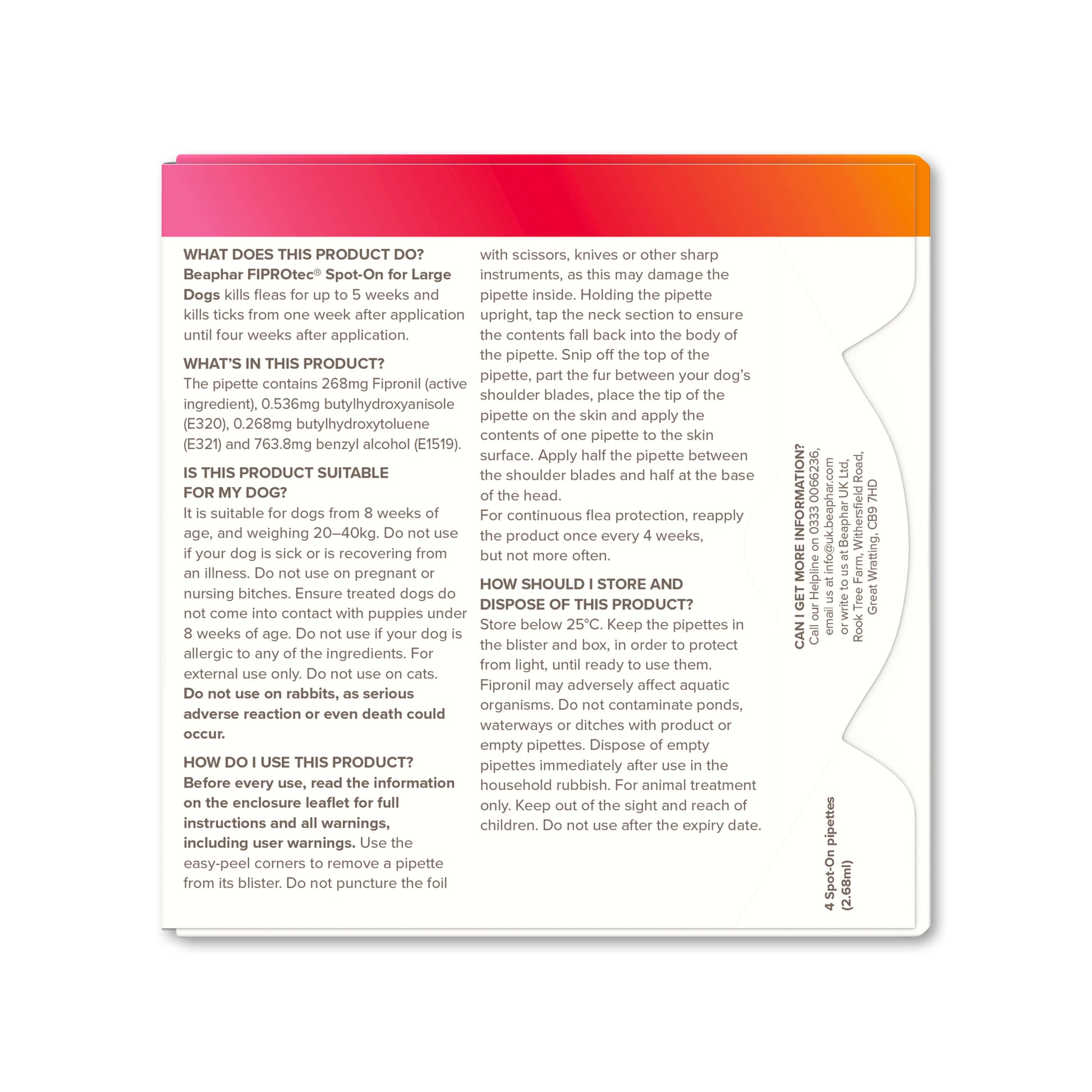 Beaphar FIPROtec Spot-On for Large Dogs is an effective and affordable veterinary strength medicine to control fleas and ticks on your dog.