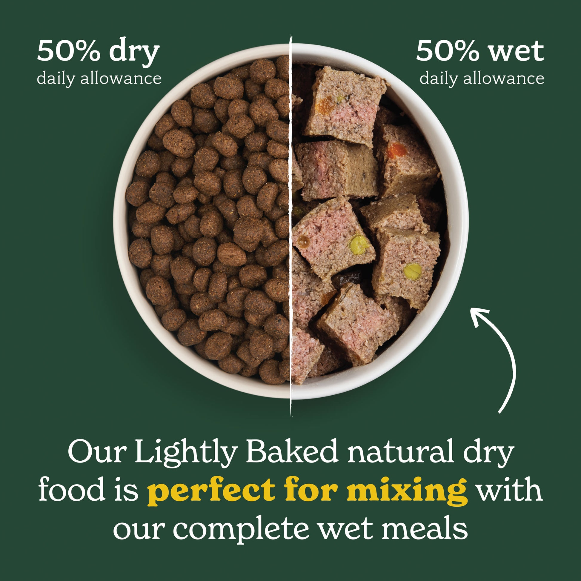Our Lightly Baked natural dry dog food is bursting with goodness and made using natural ingredients along with vitamins and minerals. 50% Chicken and grain free recipe making the food perfect for even the most sensitive of tummies. Suitable for dogs 1 year +.