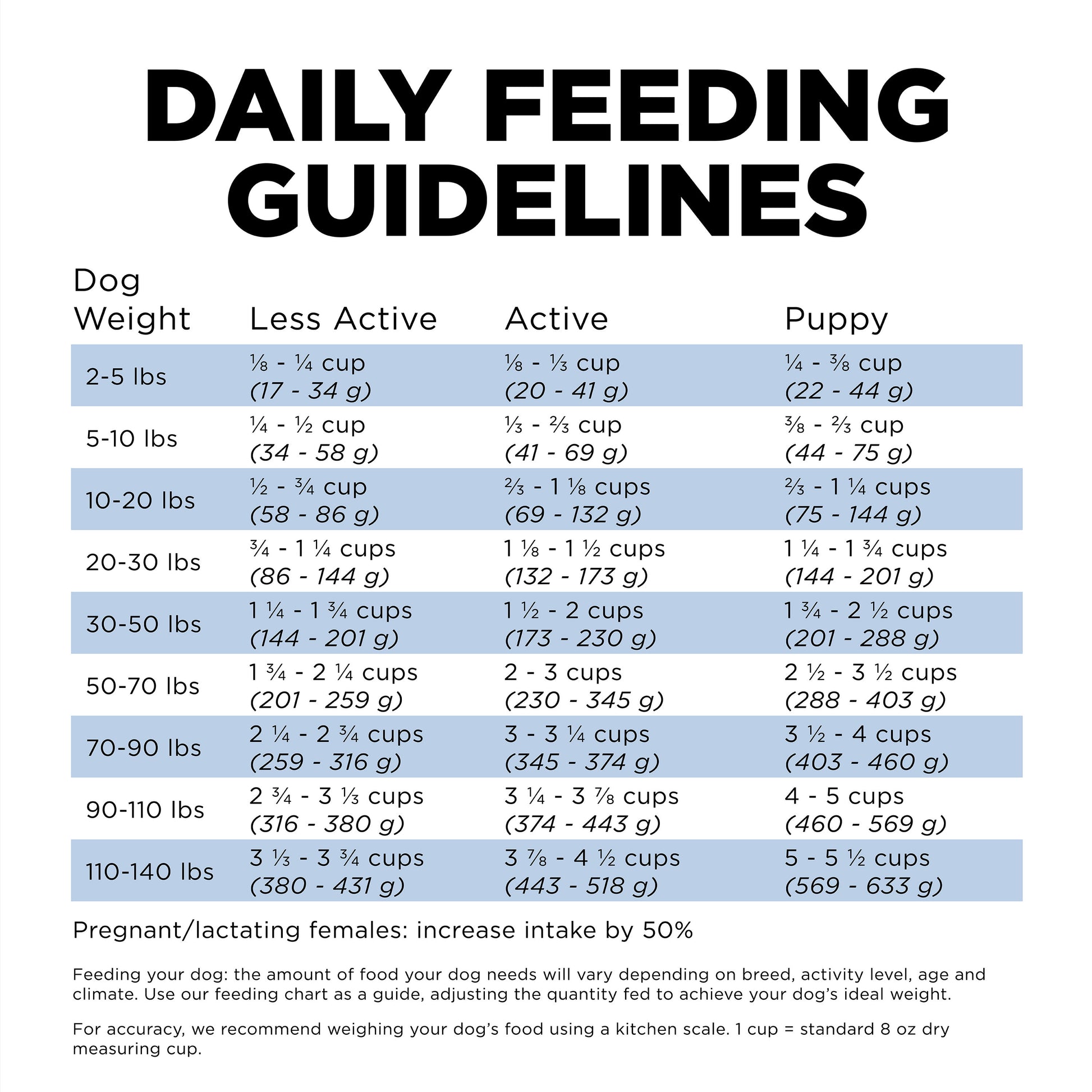 | 9-13,6 kg (20-30 lb) | 86 - 144 g (¾-1¼ cups) | 132 - 173 g (1⅛-1½ cups) | 144 - 201 g (1¼-1¾ cups) |