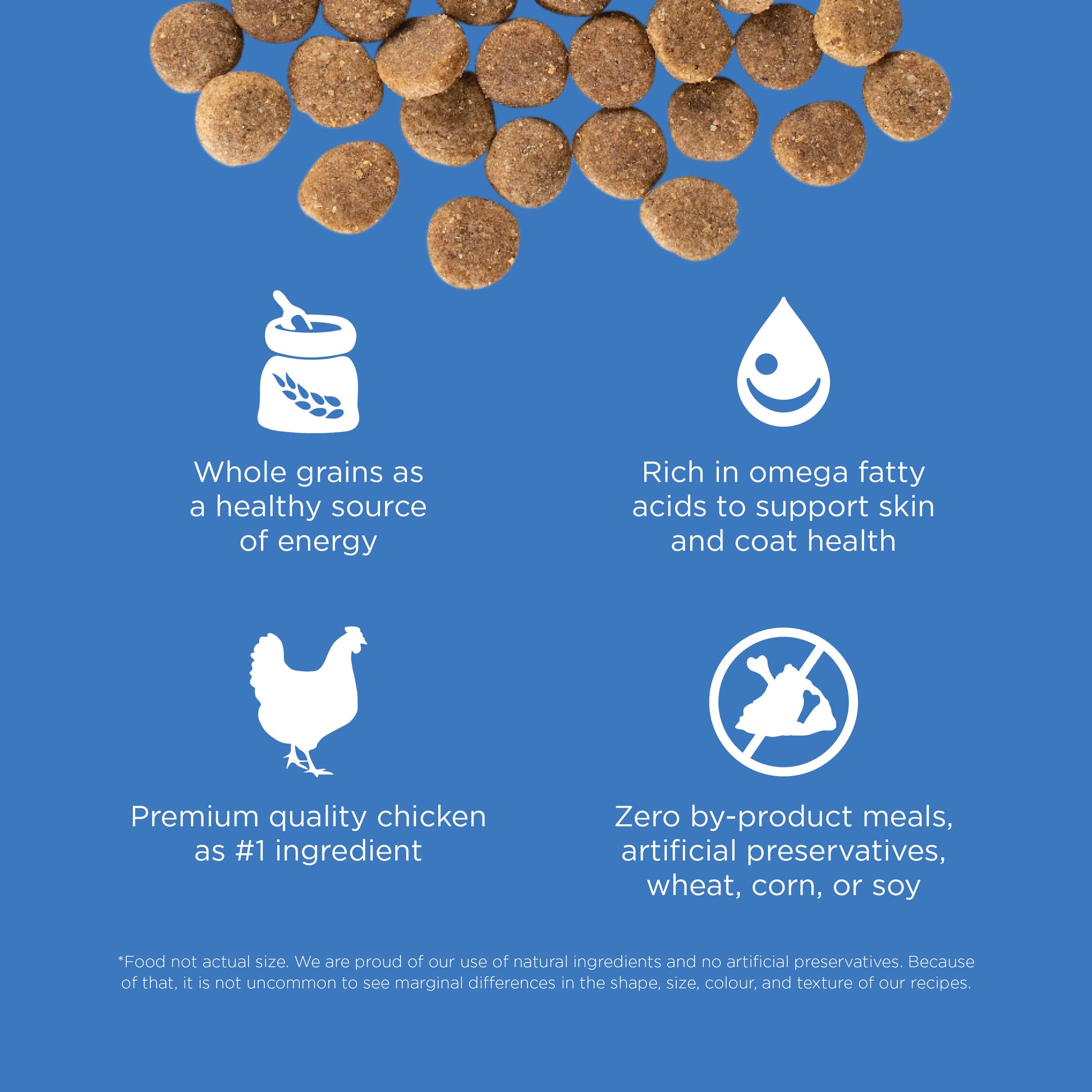 Dry skin and dull coats can start from compromised and damaged skin-barriers. That’s why our Skin + Coat Care Chicken dry dog food Recipe with Grains was formulated by our expert pet nutritionists with omega fatty acids to help keep your dog’s skin hydrated and their coat healthy. Made with premium quality ingredients, like de-boned chicken, antioxidant-rich fruits + veggies, and energizing whole grains, this recipe offers complete and balanced nutrition that takes a proactive approach to your dog’s skin and coat health.