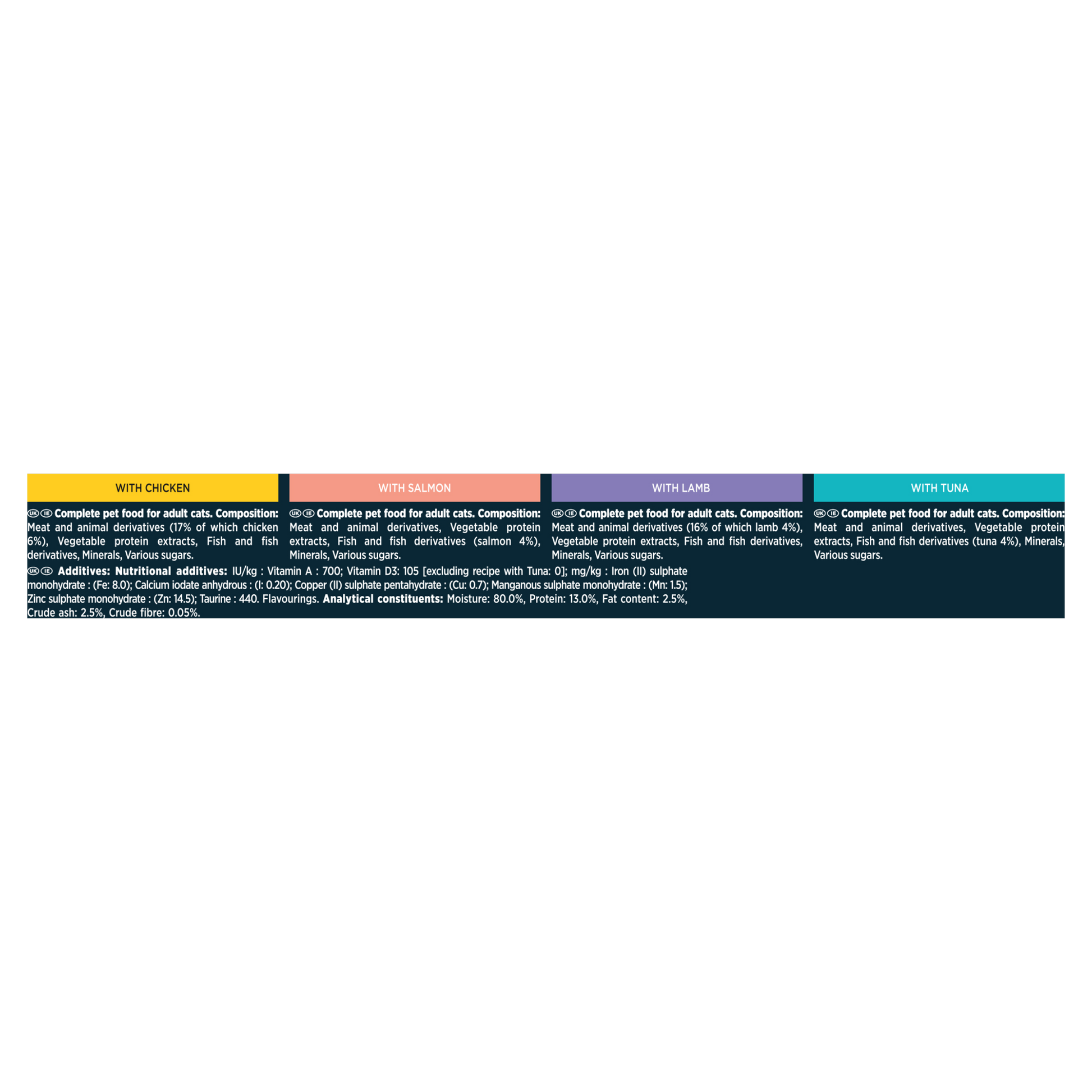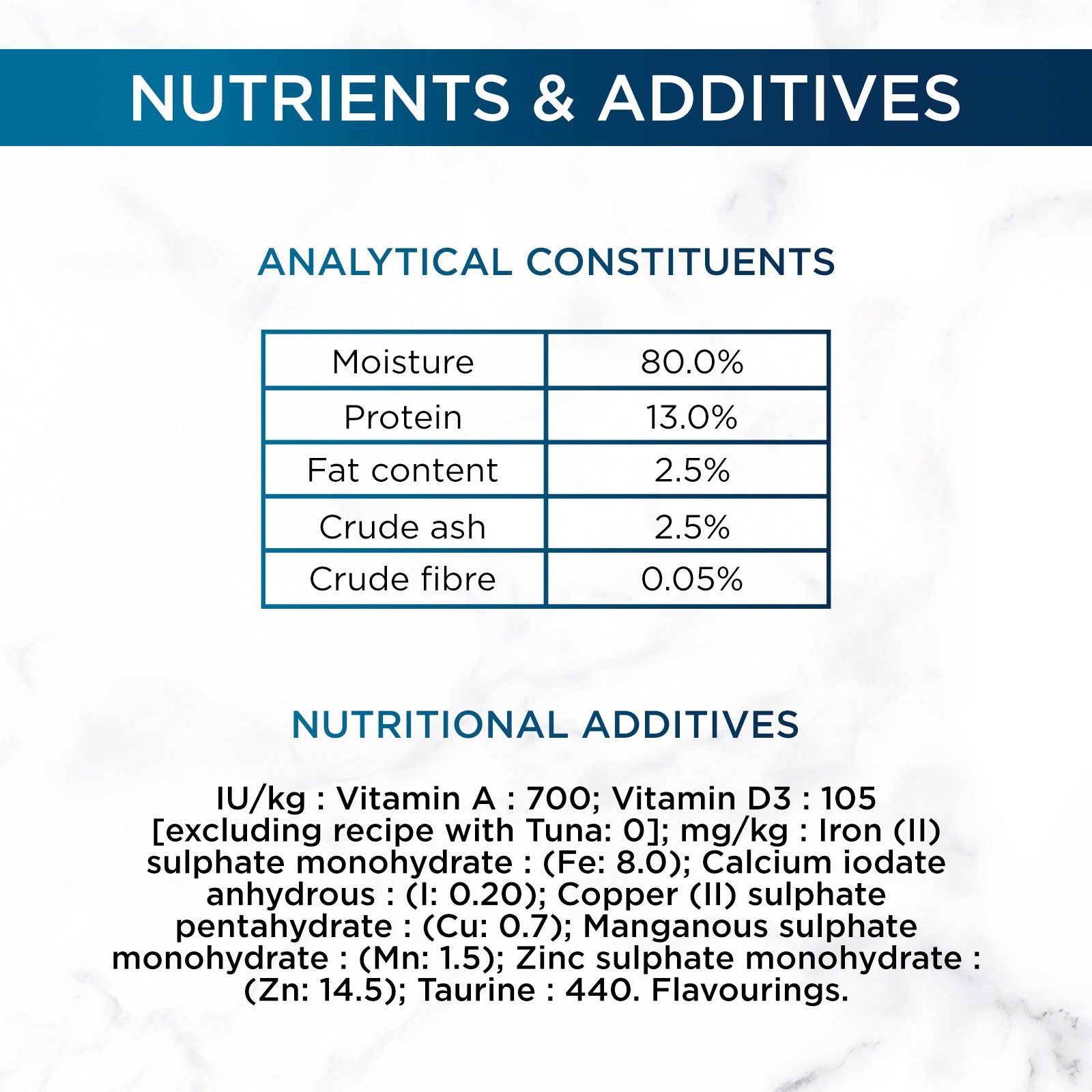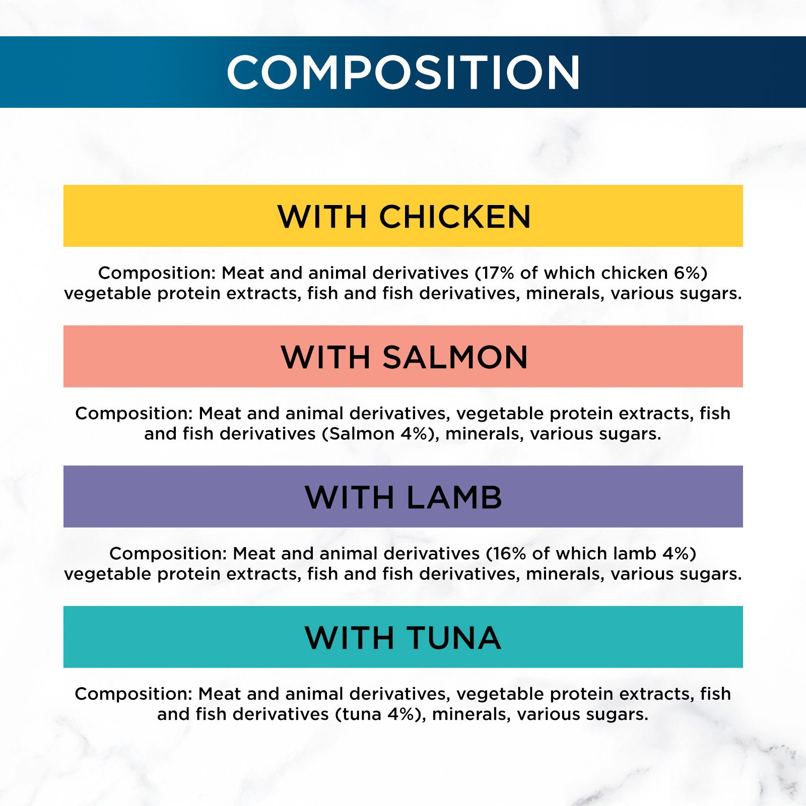 Tuna: Meat and animal derivatives, vegetable protein extracts, fish and fish derivatives (tuna 4%), minerals, various sugars.