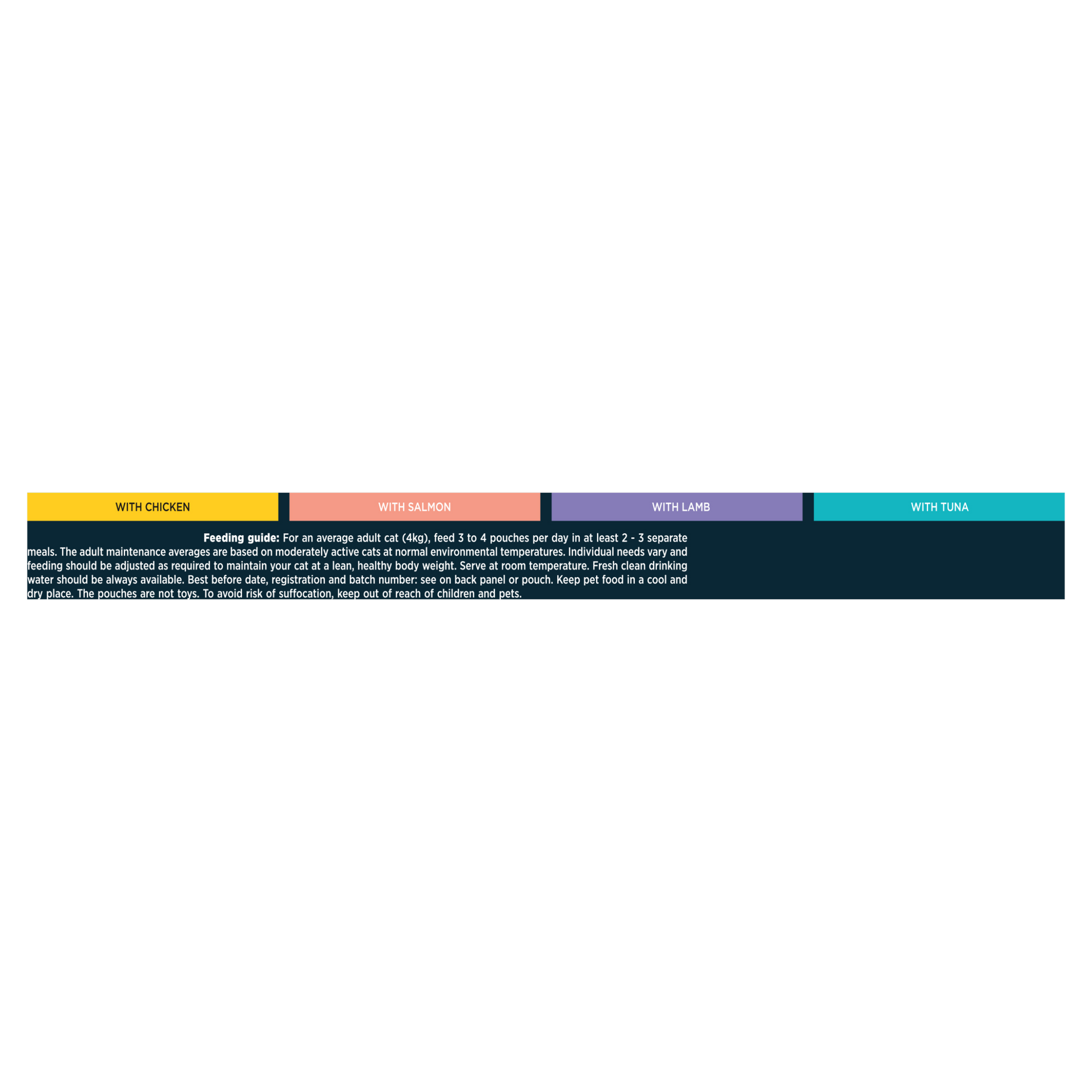 Feeding Guide: For an average adult cat (4kg), feed 3 to 4 pouches per day in at least 2-3 separate meals. The adult maintenance averages are based on moderately active cats at normal environmental temperatures. Individual needs vary and feeding should be adjusted as required to maintain your cat at a lean, healthy body weight. Serve at room temperature. Fresh clean drinking water should be always available.