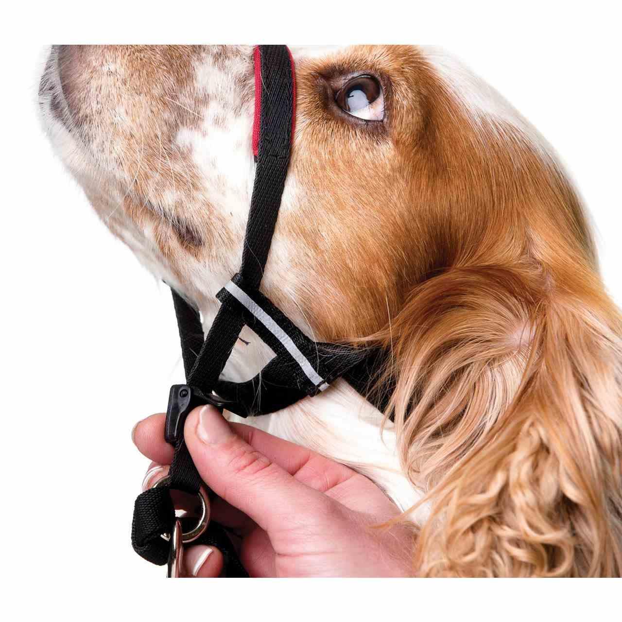 The Halti Optifit Headcollar's unique design stops dogs from pulling by gently directing the dog's head so that the body has to follow, steering him into desired positions just like a horse. Designed to give dogs an optimum fit whatever their face shape, with a self-adjusting chin strap that follows the contours of a dog's face. Halti Optifit is a specialist training program which guarantees to stop your dog from pulling. The pack includes a Halti Optifit head collar, comprehensive training DVD, booklet and a Halti safety link. Time should be taken when accustoming a dog to the Halti Optifit, in order to create a positive association with it. Initially, place the nose-band flat in your hand and feed your dog treats, so that he learns to happily put his nose through it. Once your dog is used to the nose-band, you can secure the neck section so that it is snug, but not too tight.