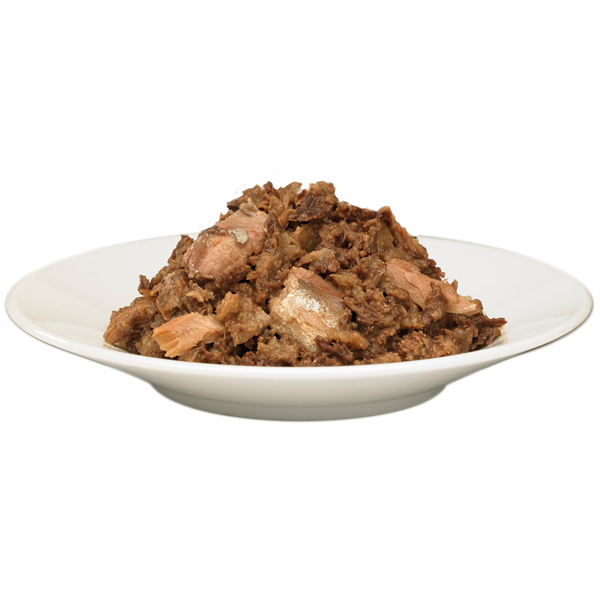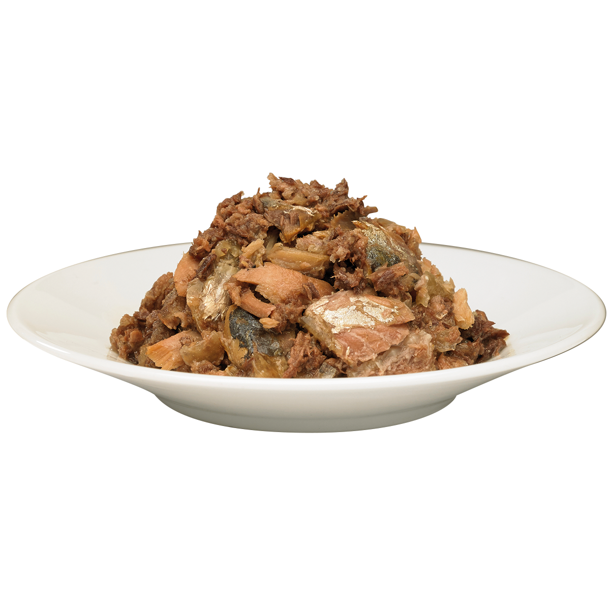Tuna flakes: Dolphin-safe tuna (50%), sunflower oil, yeast extract, cassava extract, minerals, chicory extract (50 mg/kg), yucca extract (50 mg/kg).Tuna with mackerel: Dolphin-safe tuna (35%), mackerel (15%), sunflower oil, yeast extract, cassava extract, minerals, chicory extract (50 mg/kg), yucca extract (50 mg/kg).