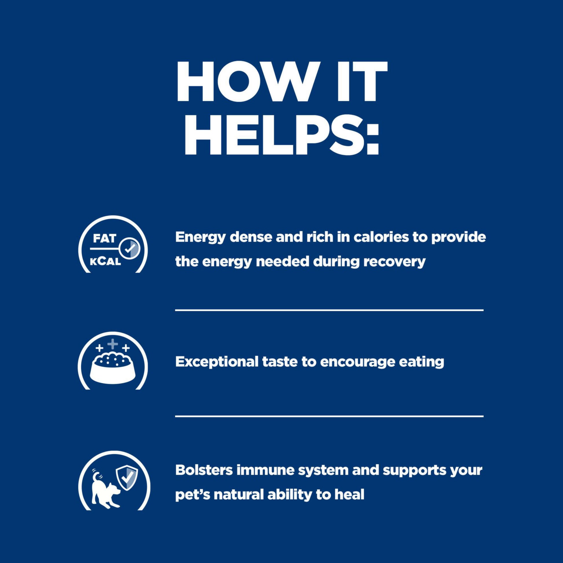 Dogs and cats can undergo significant metabolic changes when recovering from surgery, illness or injury. While under these stressful conditions, your pet is challenged to maintain their strong natural defenses which makes it even more important to feed the right food to help your pet bounce back from these tough situations.
