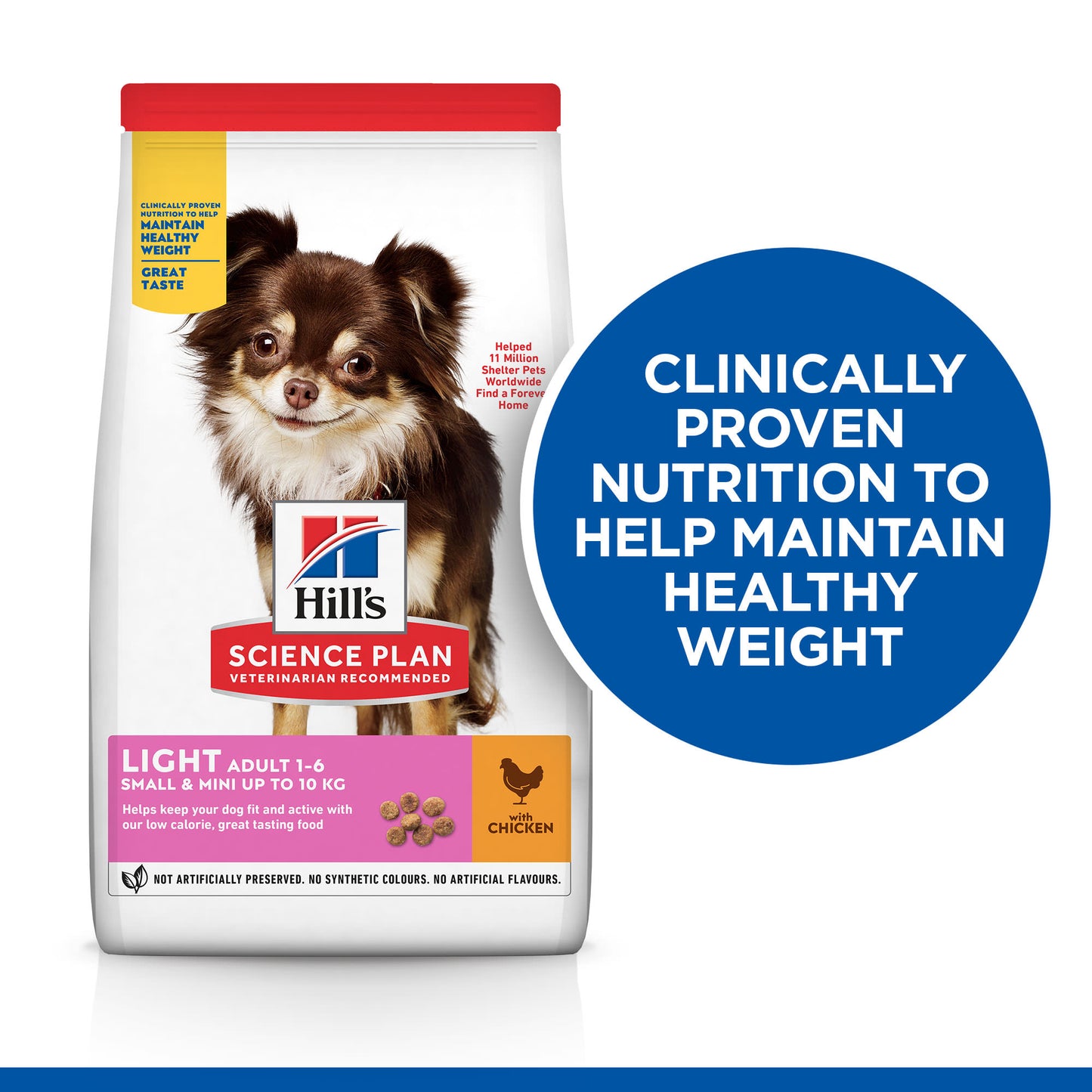 Big on Love, Small in Size. Hill's Science Plan Light Small & Mini Adult dog food is tailored nutrition for less active adult small dogs requiring a low calorie food to help maintain a healthy weight & lifestyle. Specially made with our smallest kibble, Low calories & L-Carnitine help promote ideal body weight, Satiety control. Keeps your dog satisfied between meals.