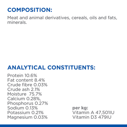 Analytical Constituents: Omega-6 Fatty Acids: 2.4%, Crude Ash: 5.2%, Fat Content: 10.3%, Crude Fibre: 1.2%, Calcium: 0.77%, Phosphorus: 0.67%, Sodium: 0.35%, Potassium: 0.69%, Magnesium: 0.09%, Protein: 31.7%.