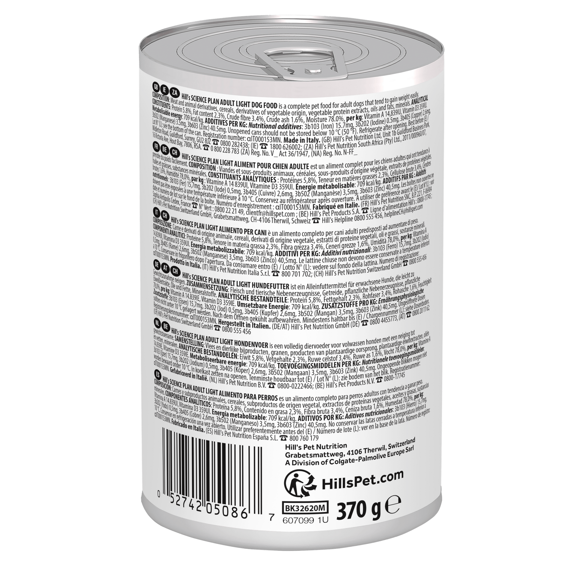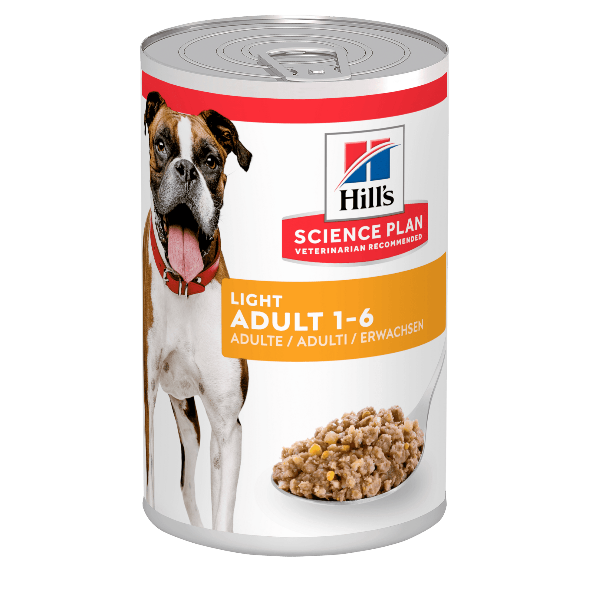 Want to give your adult dog a tasty, low-calorie pet food? HILL'S SCIENCE PLAN Light Adult canned dog food helps keep your dog fit and active with our low calorie, great tasting food. This wet dog food is made with quality protein and fibre to keep your dog satisfied between meals and contains omega-6 fatty acids and vitamin E to support healthy skin and shiny fur.