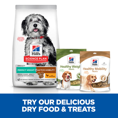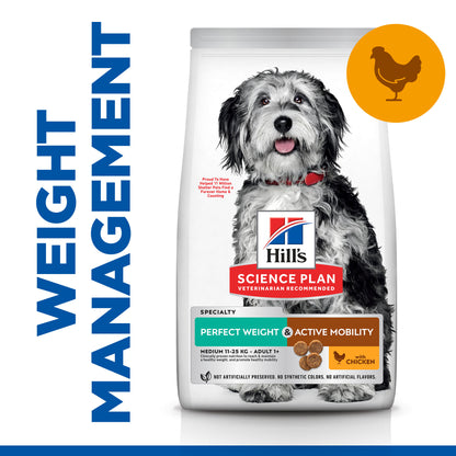 Hill's Science Plan Perfect Weight & Active Mobility Medium Adult dog food with Chicken provides delicious, breakthrough weight management nutrition that your full-grown dog can enjoy. With protein for lean muscle maintenance, and clinically proven omega-3 rich fish oil to support joint mobility, this weight control dog food is the perfect addition to your adult dog's bowl. This healthy weight dog food is formulated with decades of cutting-edge research to be a great-tasting meal your grown large dog can truly enjoy.