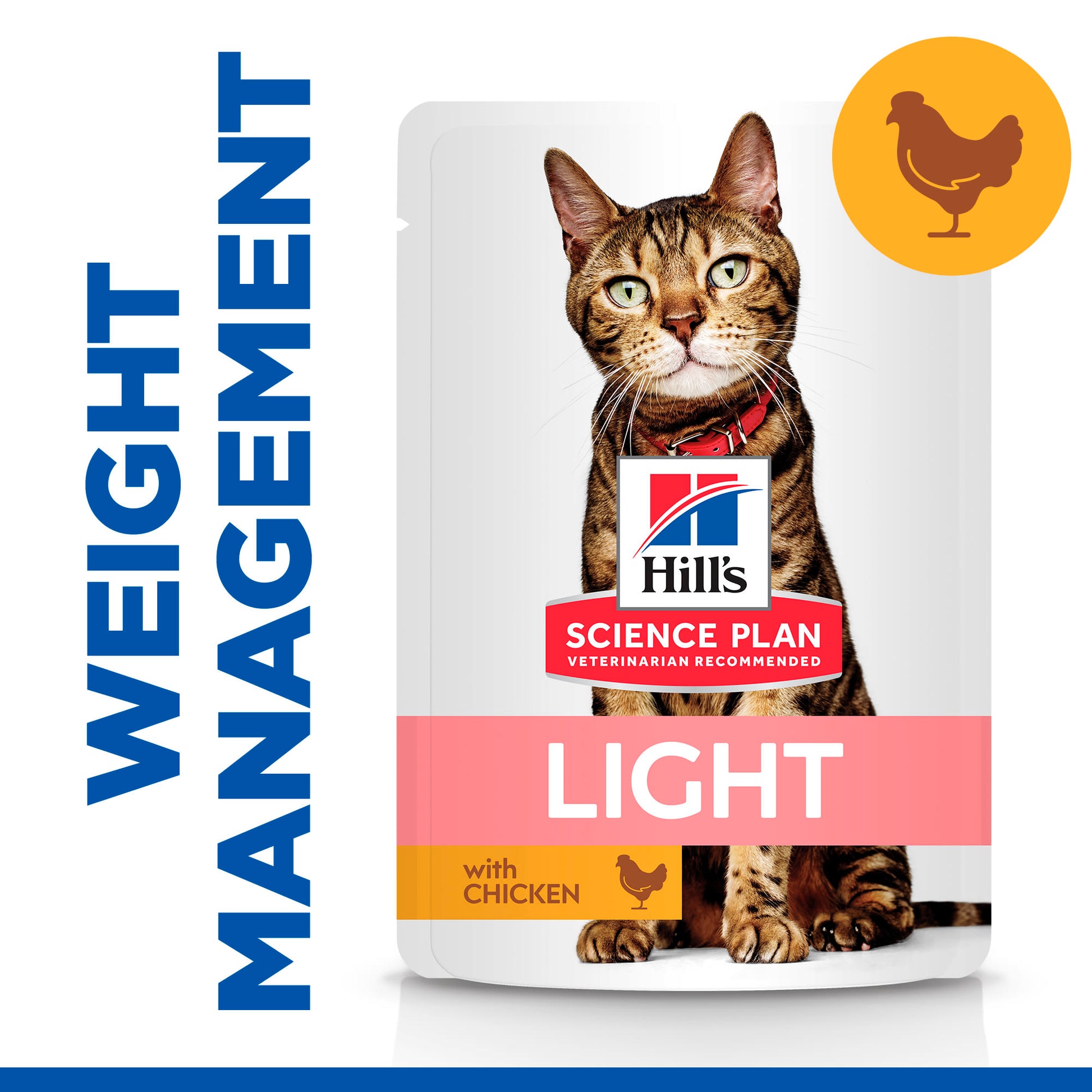 Hill's Science Plan Light Adult cat food tender chunks in gravy. It has the perfect balance of taste and nutrition for less active adult cats requiring a low calorie food to maintain a healthy weight & lifestyle. Low calories & L-Carnitine help promote ideal body weight. High-quality protein & natural fibers help satisfy hunger between meals. Omega-6s & Vitamin E for beautiful skin & furCouldn't load pickup availability