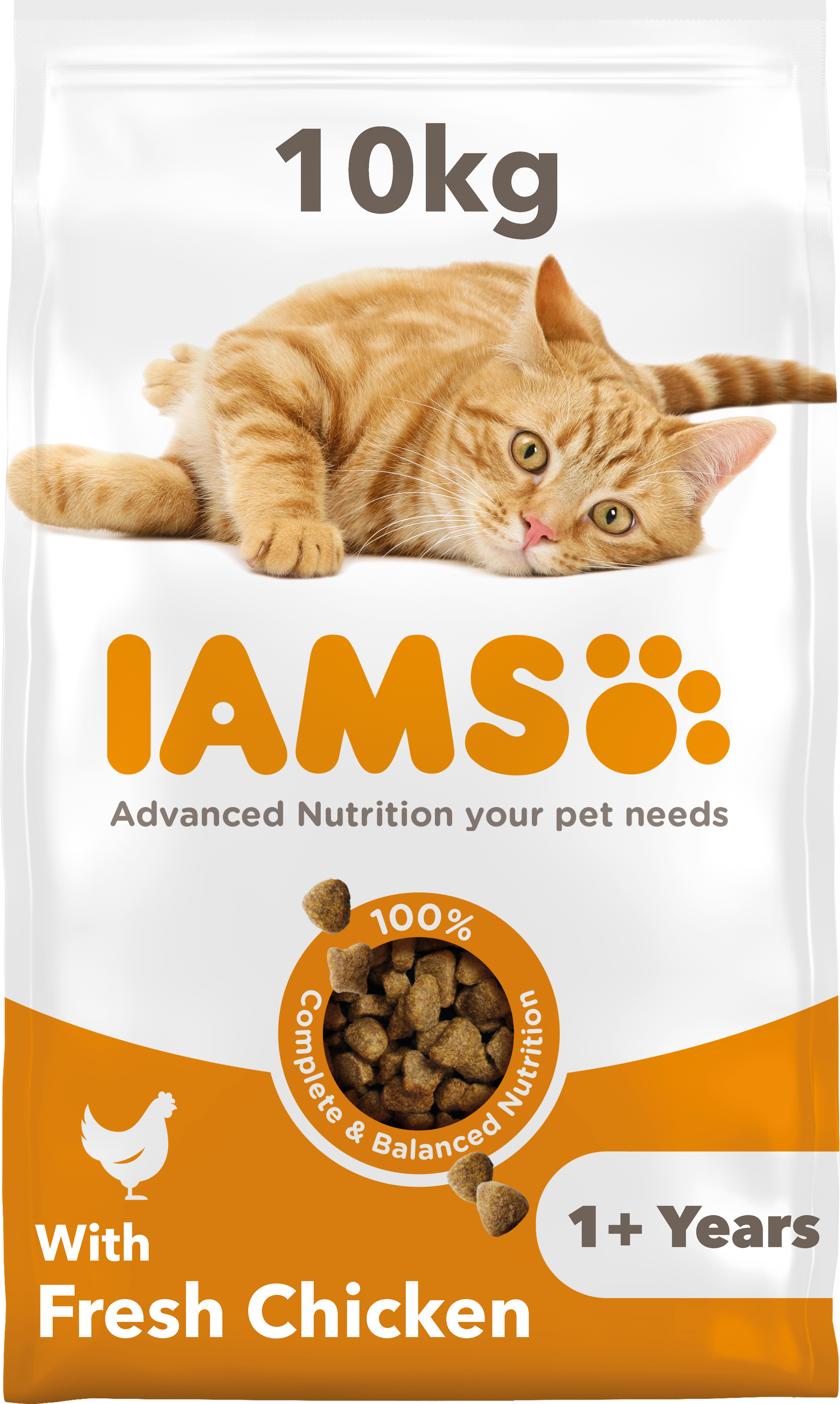 IAMS for Vitality for adult cats with Fresh Chicken is a 100% complete and balanced cat food for your cat. Our improved recipe contains 87% animal protein (out of total protein). With no fillers, artificial colours, flavours or GMOs and a wheat free recipe (produced in a factory that handles wheat). Only you know your pet's individual character, but IAMS knows the nutrition they need for the 7 signs of healthy vitality.
