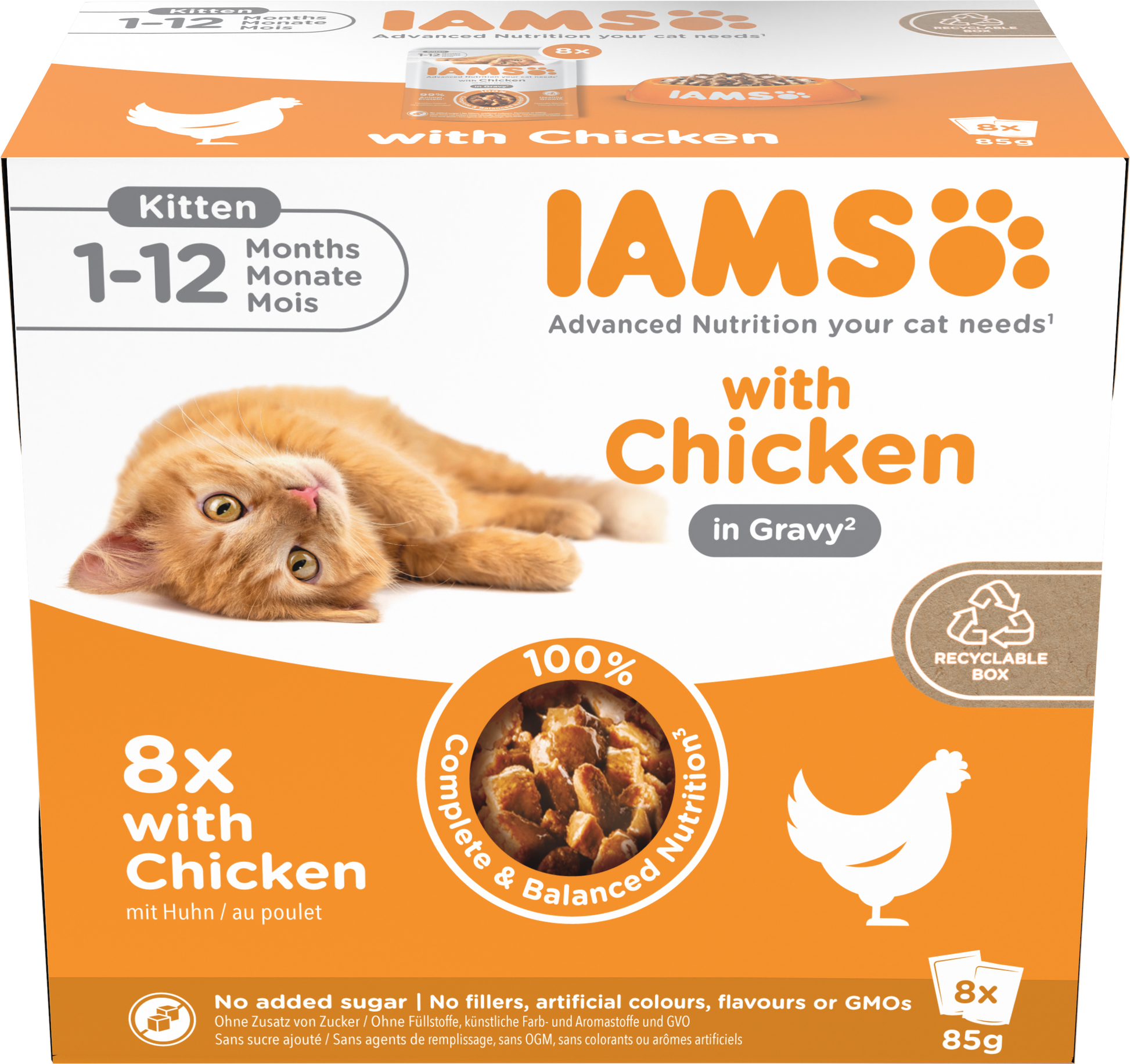 IAMS Advanced Nutrition with Chicken in Gravy is a 100% complete and balanced kitten wet cat food, suitable for cats aged 1 - 12 months. Our advanced nutrition recipes are adapted to support your cat's health, providing all the nutrients your cat needs. IAMS kitten food with chicken in gravy contains 99% animal protein, out of total protein, to provide the foundation of their natural diet and essential vitamins and minerals to support your kitten's healthy growth. IAMS wet cat food recipes contain no added sugar - for a high-quality, balanced wet food aligned to your cat's natural diet.