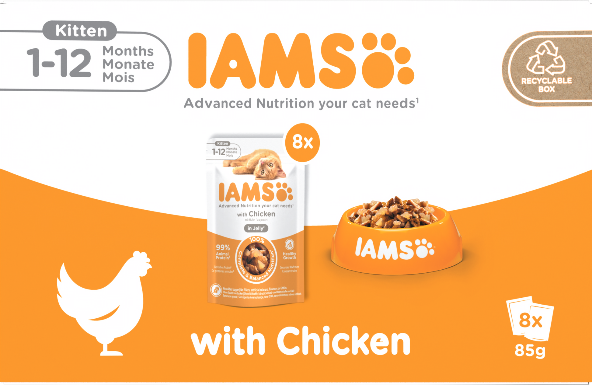 IAMS Advanced Nutrition with Chicken in Jelly is a 100% complete and balanced kitten wet cat food, suitable for cats aged 1 - 12 months. Our advanced nutrition recipes are adapted to support your cat's health, providing all the nutrients your cat needs. IAMS kitten food with chicken in jelly contains 99% animal protein, out of total protein, to provide the foundation of their natural diet and essential vitamins and minerals to support your kitten's healthy growth. IAMS wet cat food recipes contain no added sugar - for a high-quality, balanced wet food aligned to your cat's natural diet.