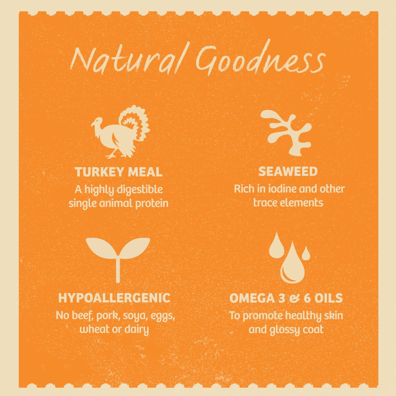 Composition: Turkey (29.8%), pea starch, dried carrots (including 1% dried carrots, equivalent to 8.1% carrots), dried potatoes (including 1% dried potatoes, equivalent to 4.1% potatoes), dried peas (including 1% dried peas, equivalent to 3.8% peas),sugar, beet pulp, dextrose, minerals, sunflower oil, pea protein, linseed oil, alfalfa, seaweed (0.13%), fish oil, tomato powder.