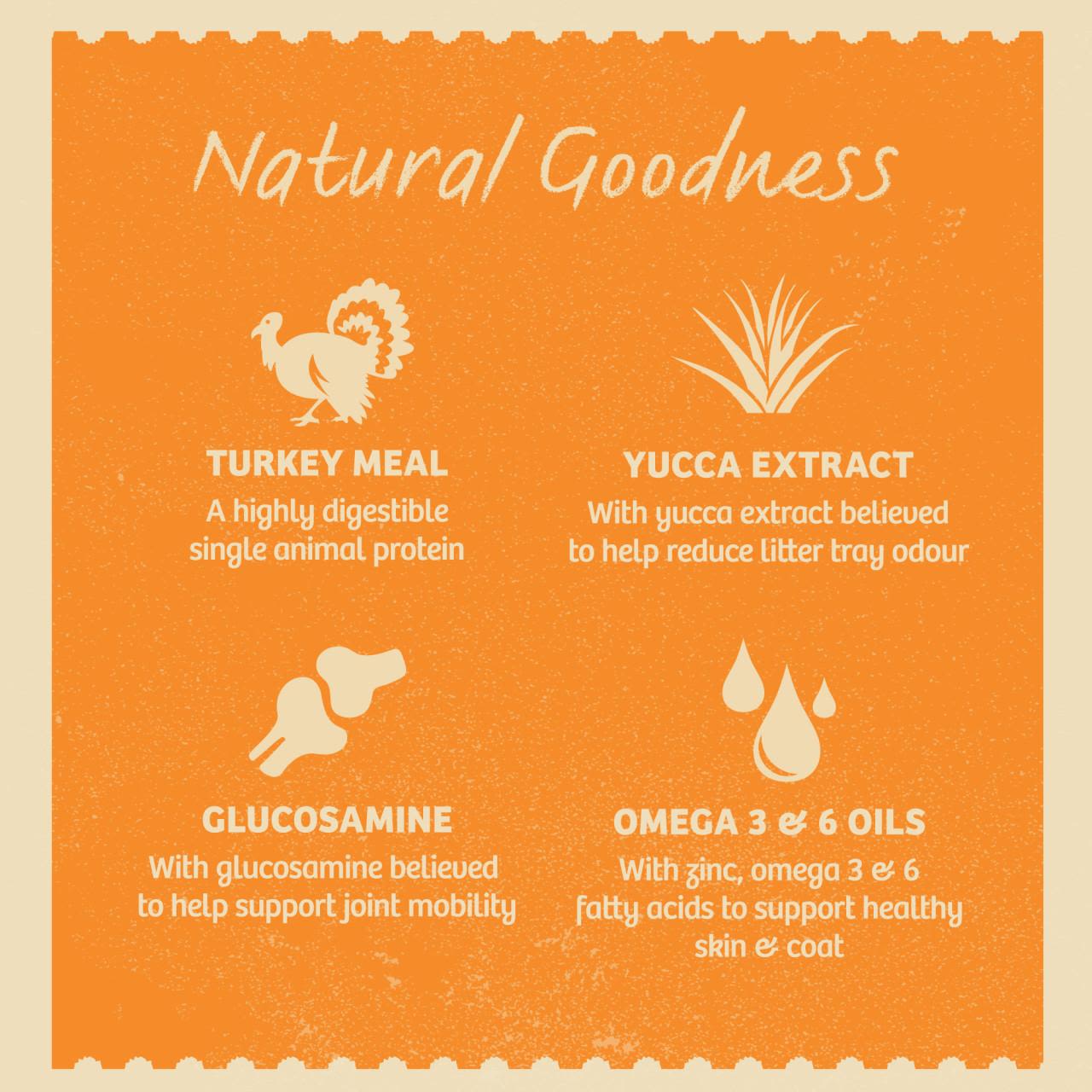 Good food and none of those terrible derivatives or other bad ingredients. Suits sensitive tums and a welcome end to terribly stinky litter trays.