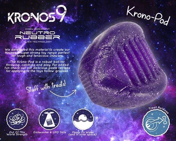 The Krono-Pod is a robust ball for throwing, catching and play. For added fun check out our delicious paste recipe for adding to the toys hollow grooves.