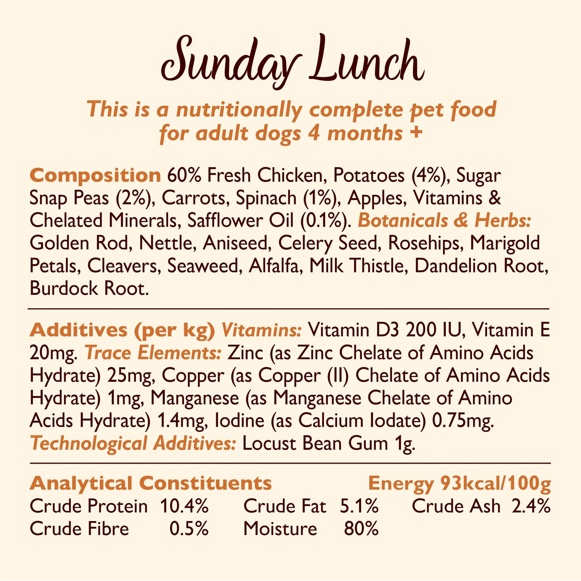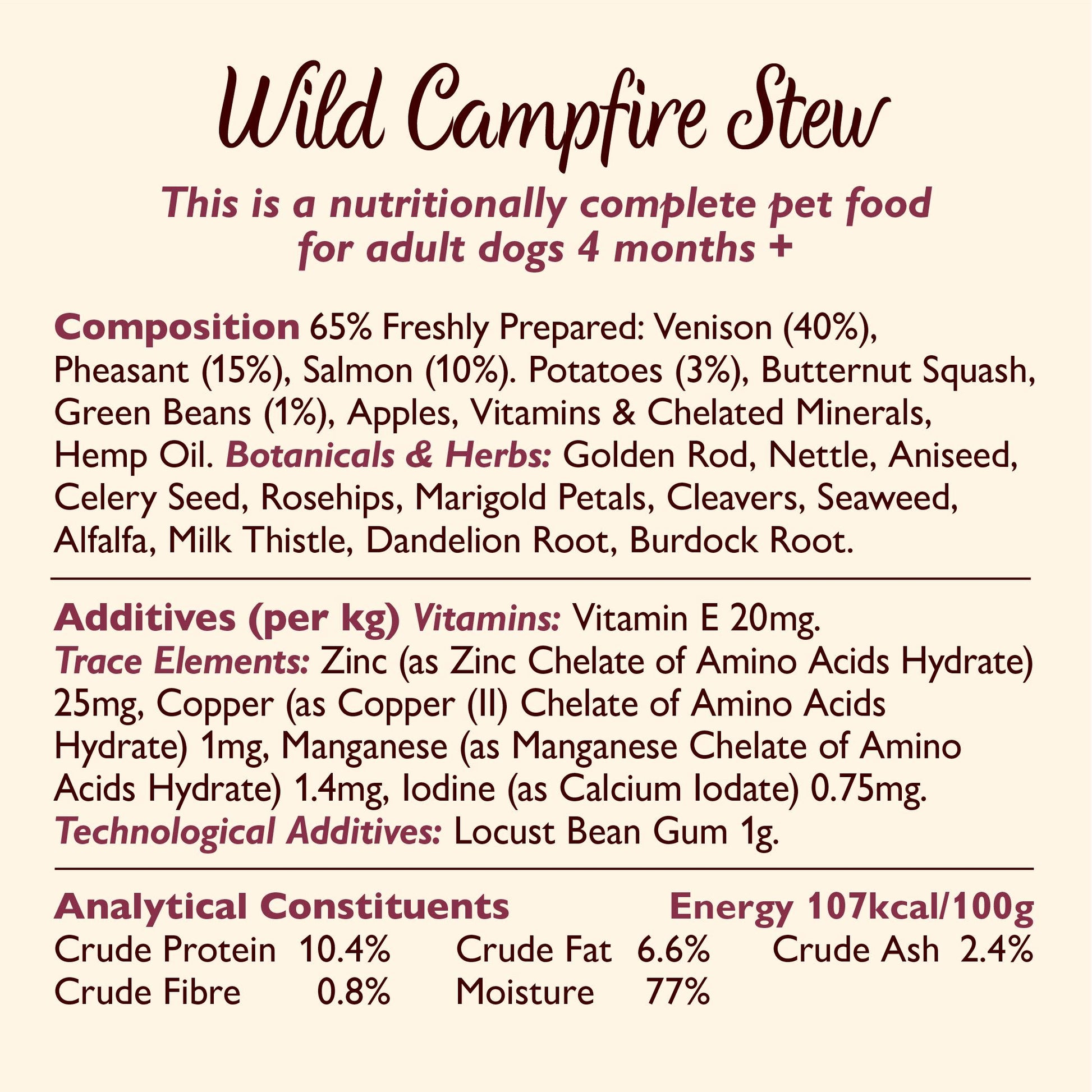 Daily Feeding Guidelines This is a nutritionally complete pet food for adult dogs 4 months +. It has everything your dog needs to stay healthy. Serve it at room temperature with a bowl of fresh water nearby.