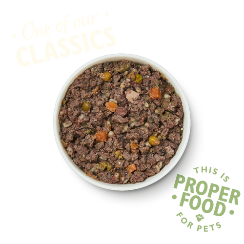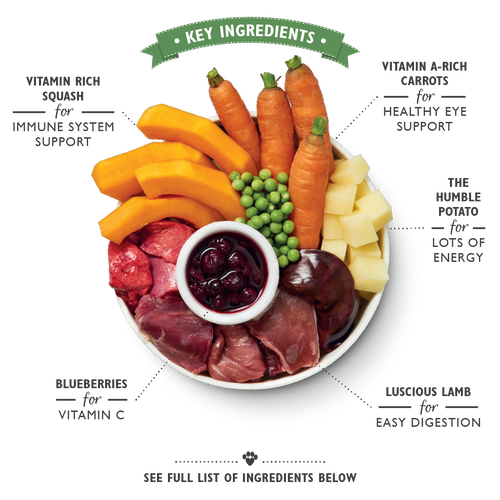 A scrumptious, satisfying dish made with fresh lamb, potatoes, and plenty of vegetables and fruits including squash, broccoli and blueberries. This much-loved, complete recipe, full of natural ingredients with added vitamins and minerals, includes our unique blend of herbs to help provide the best health benefits for your dog.